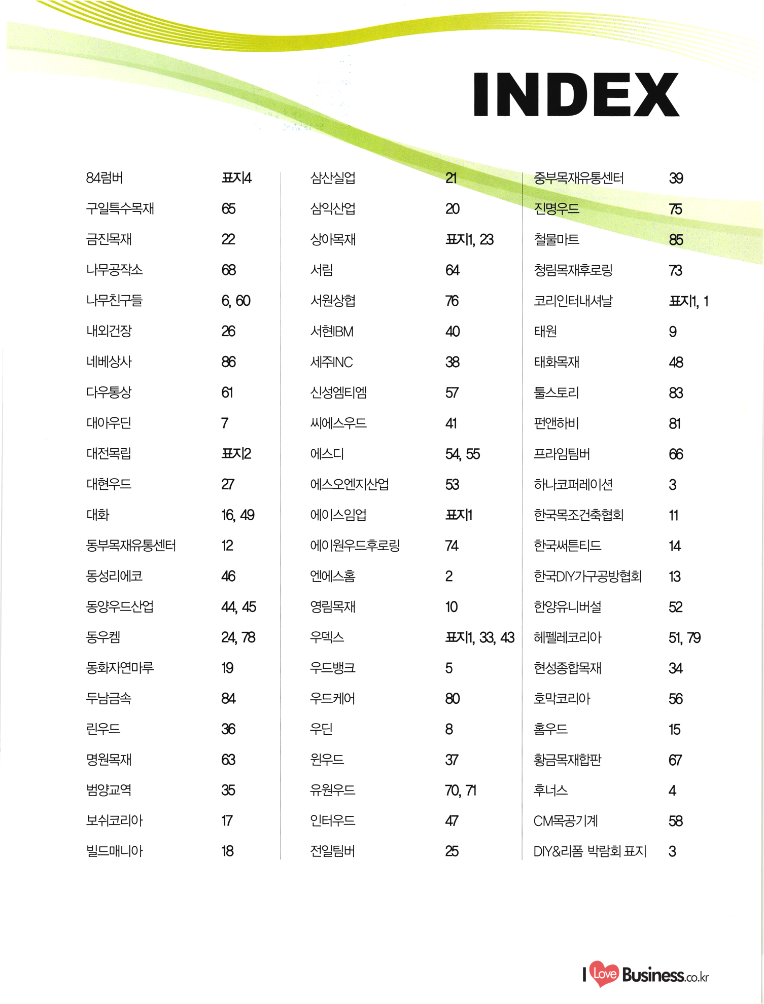 INDEX 84럼버 표지4 삼산실업 21 중부목재유통센터 구일특수목재 삼익산업 20 | 8 금진목재 상아목재 표지1, 23 철물마트 2 나무공작소 서림 청림목재후로링 8 나무친구들 서원상협 6 코리인터내셔날 표지1, 1 내외건장 8 서현BM 태원 9 네베상사 HEINC 태화목재 8 2 다우통상 신성엠티엠 툴스토리 6 8 대아우딘 씨에스우드 펀앤하비 7 5 대전목립 표지2 에스디 프라임팀버 8 대현우드 에스오엔지산업 하나코퍼레이션 3 대화 에이스임업. 한국목조건축협회 1 표지1 74 | 동부목재유통센터 에이원우드후로링 4 한국써튼티드 한국DIY가구공방협회 동성리에코 엔에스홈 3 동양우드산업 영림목재 한양유니버설 8 동우켐 우덱스 표지1, 33, 43 헤펠레코리아 5 동화자연마루 우드뱅크 현성종합목재 4 두남금속 우드케어 호막코리아 8 린우드 우딘 홈우드 5 명원목재 윈우드 황금목재합판 6 범양교역 유원우드 후너스 4 보쉬코리아 CM목공기계 8 인터우드 전일팀버 빌드매니아 DIY&리폼 박람회 표지 3 ILoveBusiness.co.kr