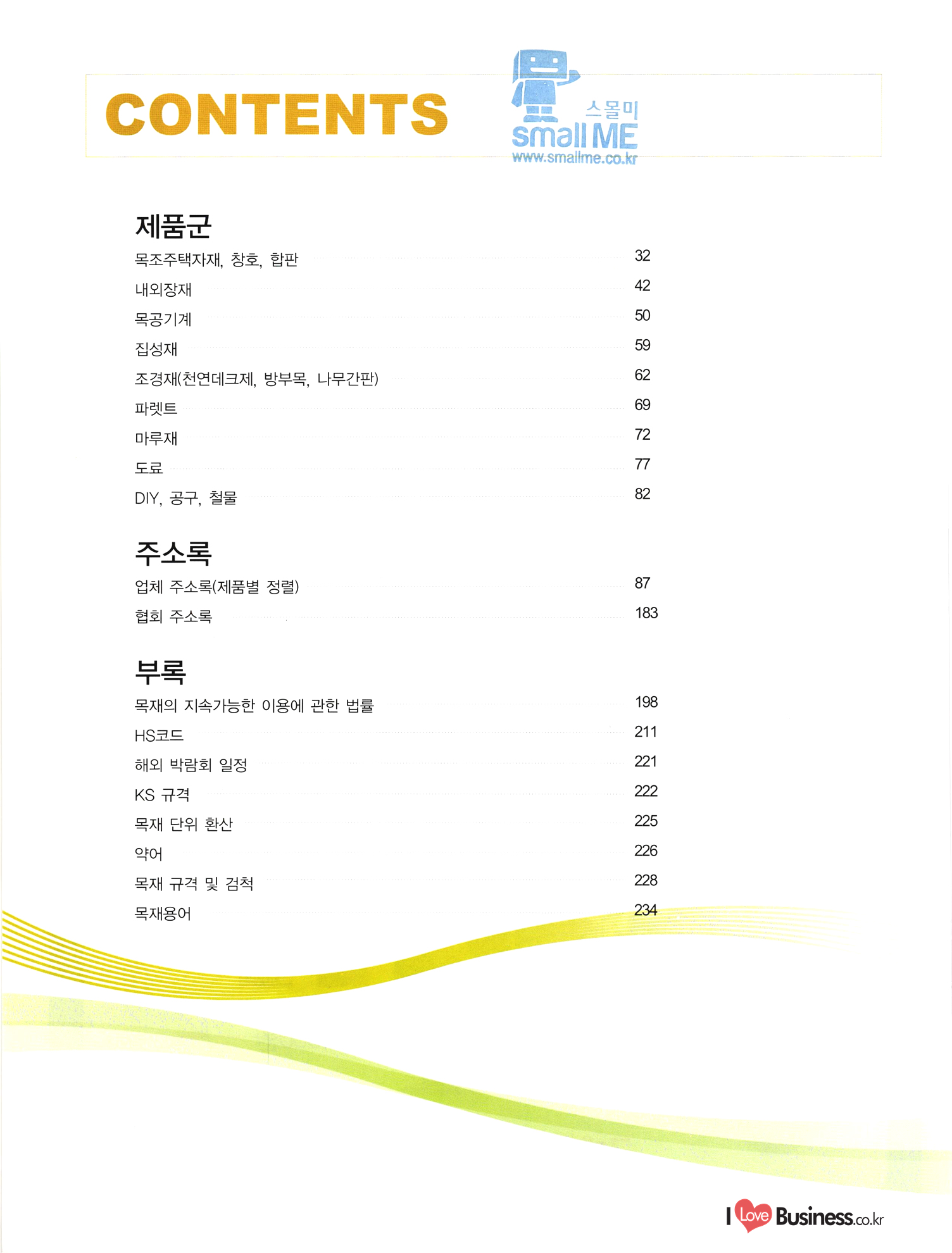 CONTENTS - 스몰미 Small ME www.smallme.co.kr 제품군 목조주택자재, 창호, 합판 내외장재 잉 목공기계 집성재 조경재(천연데크제, 방부목, 나무간판) 파렛트 마루재 도료 DIY, 공구, 철물 주소록 업체 주소록(제품별 정렬) 협회 주소록 87 ........................... | 183 부록 목재의 지속가능한 이용에 관한 법률 HS코드 198 211 해외 박람회 일정 221 KS 규격 222. 225 목재 단위 환산 약어 목재 규격 및 검척 226 228 224 목재용어
