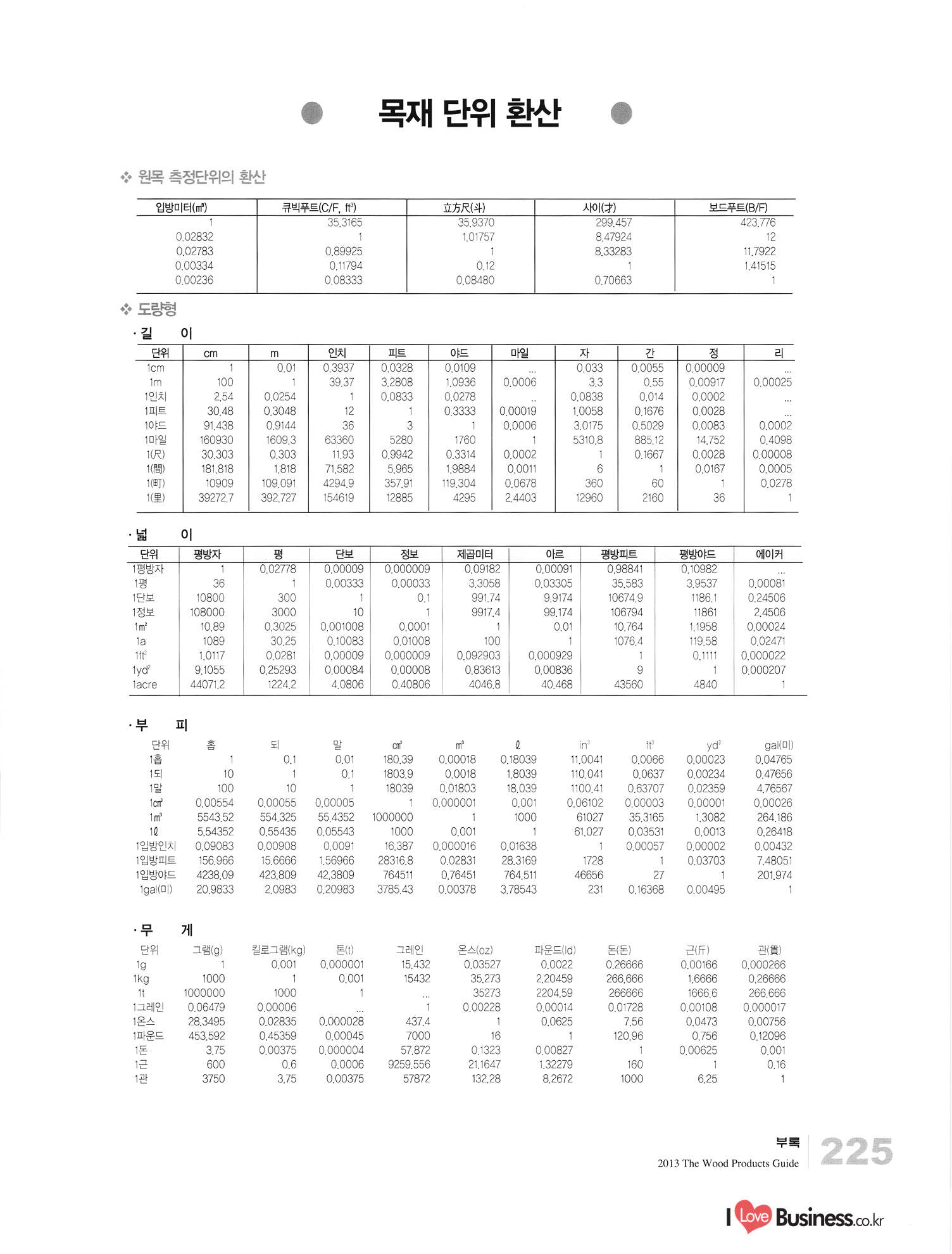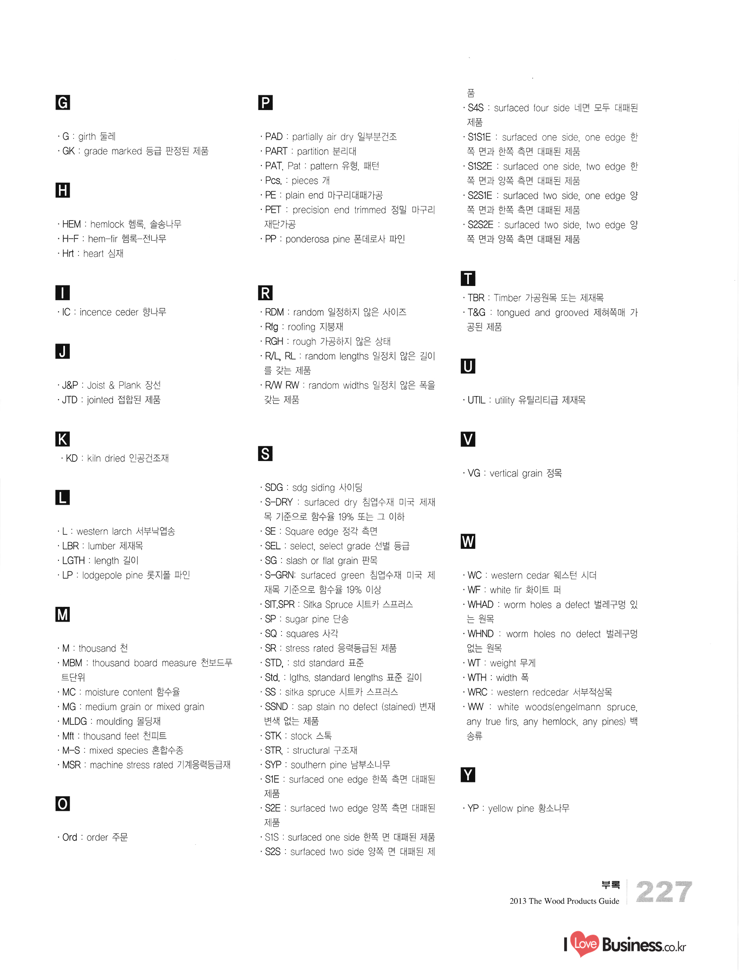 CONTENTS - 스몰미 Small ME www.smallme.co.kr 제품군 목조주택자재, 창호, 합판 내외장재 잉 목공기계 집성재 조경재(천연데크제, 방부목, 나무간판) 파렛트 마루재 도료 DIY, 공구, 철물 주소록 업체 주소록(제품별 정렬) 협회 주소록 87 ........................... | 183 부록 목재의 지속가능한 이용에 관한 법률 HS코드 198 211 해외 박람회 일정 221 KS 규격 222. 225 목재 단위 환산 약어 목재 규격 및 검척 226 228 224 목재용어