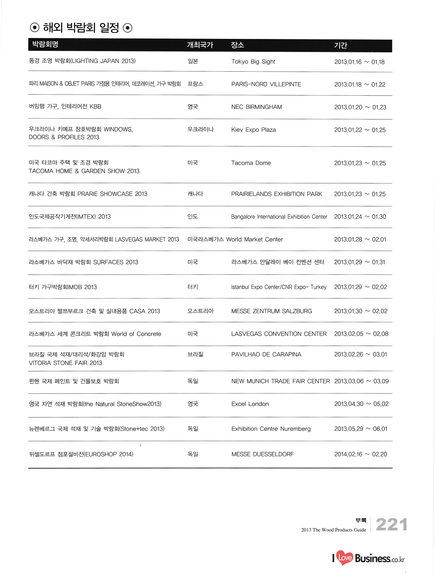 INDEX 84럼버 표지4 삼산실업 21 중부목재유통센터 구일특수목재 삼익산업 20 | 8 금진목재 상아목재 표지1, 23 철물마트 2 나무공작소 서림 청림목재후로링 8 나무친구들 서원상협 6 코리인터내셔날 표지1, 1 내외건장 8 서현BM 태원 9 네베상사 HEINC 태화목재 8 2 다우통상 신성엠티엠 툴스토리 6 8 대아우딘 씨에스우드 펀앤하비 7 5 대전목립 표지2 에스디 프라임팀버 8 대현우드 에스오엔지산업 하나코퍼레이션 3 대화 에이스임업. 한국목조건축협회 1 표지1 74 | 동부목재유통센터 에이원우드후로링 4 한국써튼티드 한국DIY가구공방협회 동성리에코 엔에스홈 3 동양우드산업 영림목재 한양유니버설 8 동우켐 우덱스 표지1, 33, 43 헤펠레코리아 5 동화자연마루 우드뱅크 현성종합목재 4 두남금속 우드케어 호막코리아 8 린우드 우딘 홈우드 5 명원목재 윈우드 황금목재합판 6 범양교역 유원우드 후너스 4 보쉬코리아 CM목공기계 8 인터우드 전일팀버 빌드매니아 DIY&리폼 박람회 표지 3 ILoveBusiness.co.kr