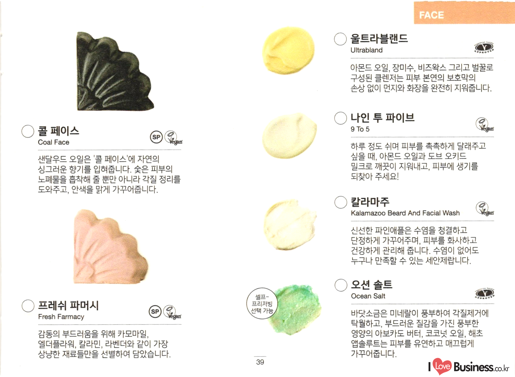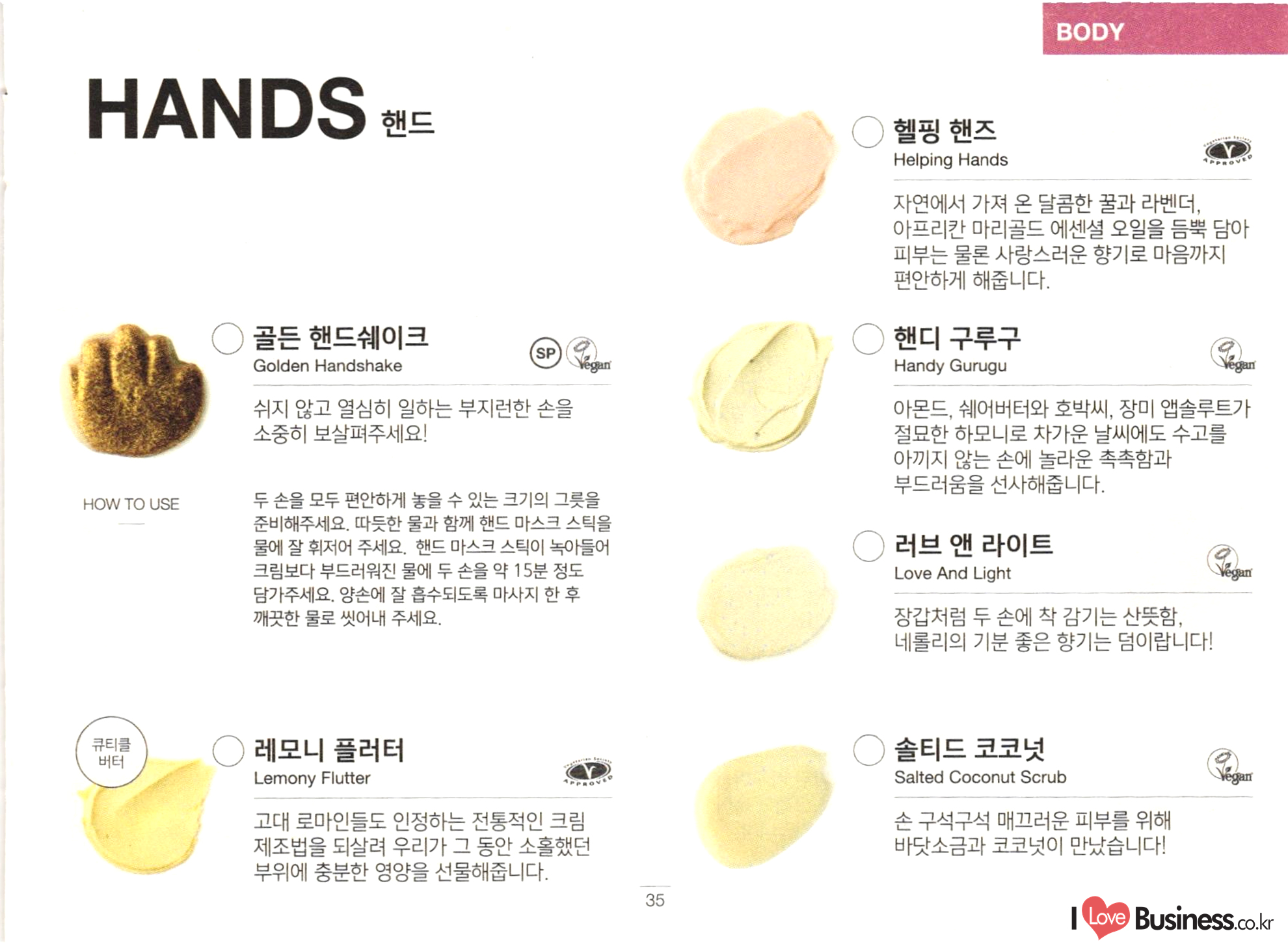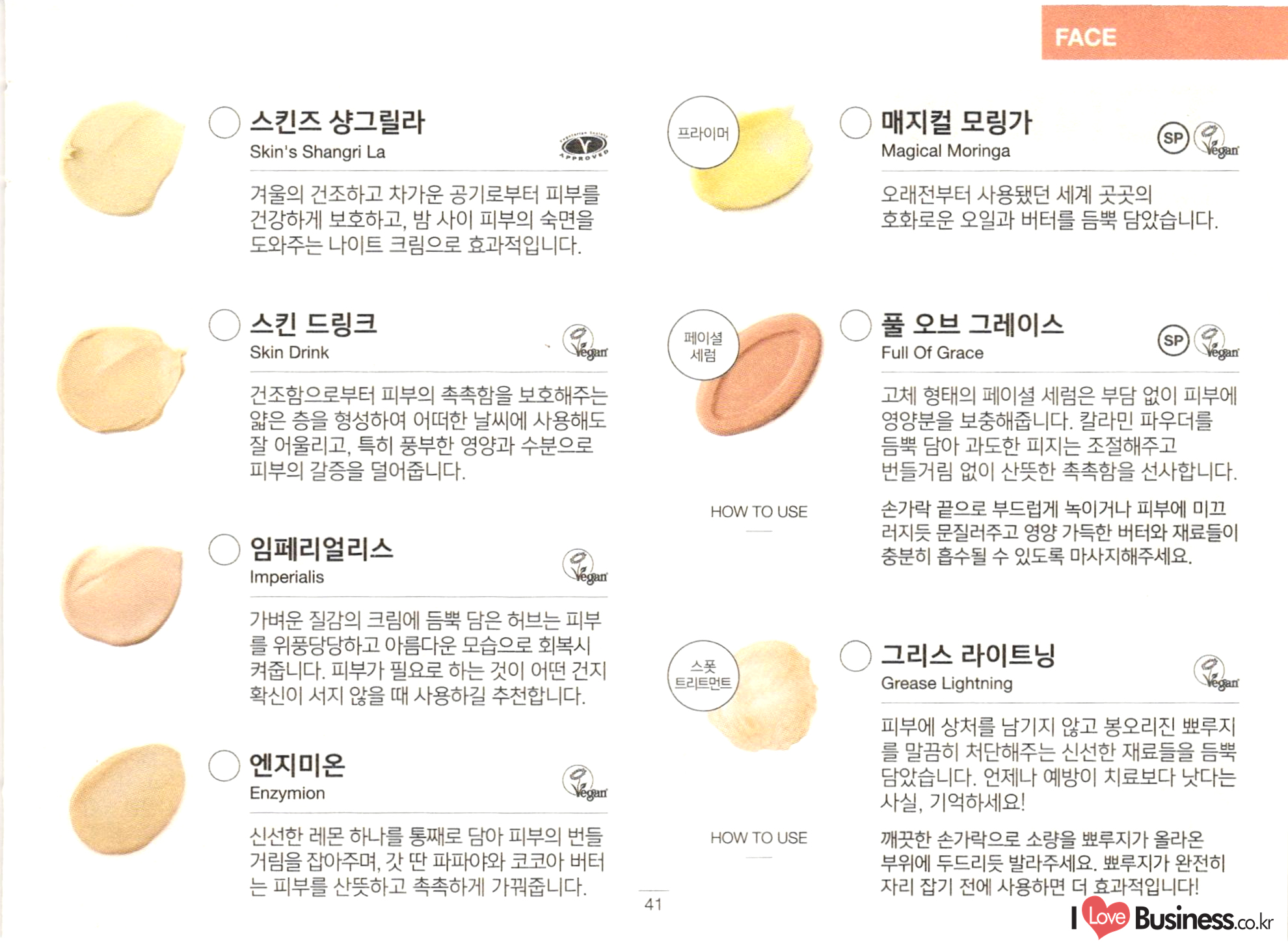 FACE ○ 스킨즈 샹그릴라 Skin's Shangri La ○ 매지컬 모링가 프라이머 Magical Moringa 겨울의 건조하고 차가운 공기로부터 피부를 건강하게 보호하고, 밤 사이 피부의 숙면을 도와주는 나이트 크림으로 효과적입니다. 오래전부터 사용됐던 세계 곳곳의 호화로운 오일과 버터를 듬뿍 담았습니다. () 스킨 드링크 Skin Drink 페이셜 세럼 풀 오브 그레이스 Full Of Grace vegar 건조함으로부터 피부의 촉촉함을 보호해주는 얇은 층을 형성하여 어떠한 날씨에 사용해도 잘 어울리고, 특히 풍부한 영양과 수분으로 피부의 갈증을 덜어줍니다. 고체 형태의 페이셜 세럼은 부담 없이 피부에 영양분을 보충해줍니다. 칼라민 파우더를 듬뿍 담아 과도한 피지는 조절해주고 번들거림 없이 산뜻한 촉촉함을 선사합니다. 손가락 끝으로 부드럽게 녹이거나 피부에 미끄 러지듯 문질러주고 영양 가득한 버터와 재료들이 충분히 흡수될 수 있도록 마사지해주세요. HOW TO USE ○ 임페리얼리스 Imperialis 가벼운 질감의 크림에 듬뿍 담은 허브는 피부 를 위풍당당하고 아름다운 모습으로 회복시 . 켜줍니다. 피부가 필요로 하는 것이 어떤 건지 확신이 서지 않을 때 사용하길 추천합니다. ○ 그리스 라이트닝 스 트리트먼트 Grease Lightning Vegant () 엔지미온 Enzymion Vegan 피부에 상처를 남기지 않고 봉오리진 뾰루지 를 말끔히 처단해주는 신선한 재료들을 듬뿍 담았습니다. 언제나 예방이 치료보다 낫다는 사실, 기억하세요! 깨끗한 손가락으로 소량을 뾰루지가 올라온 부위에 두드리듯 발라주세요. 뾰루지가 완전히 자리 잡기 전에 사용하면 더 효과적입니다! HOW TO USE 신선한 레몬 하나를 통째로 담아 피부의 번들 거림을 잡아주며, 갓 딴 파파야와 코코아 버터 는 피부를 산뜻하고 촉촉하게 가꿔줍니다.