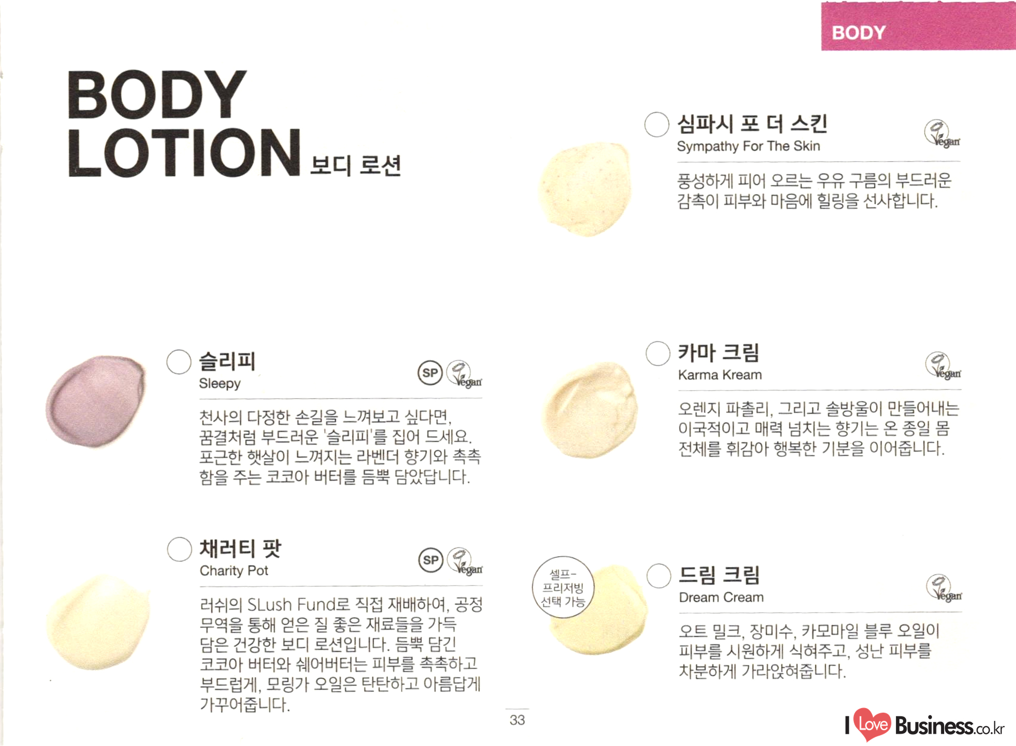 BODY BODY LOTION TEM Vegan 심파시 포 더 스킨 Sympathy For The Skin 풍성하게 피어 오르는 우유 구름의 부드러운 감촉이 피부와 마음에 힐링을 선사합니다. ○ 슬리피 ( 카마 크림 Karma Kream Sleepy vedan 천사의 다정한 손길을 느껴보고 싶다면, 꿈결처럼 부드러운 '슬리피'를 집어 드세요. 포근한 햇살이 느껴지는 라벤더 향기와 촉촉 함을 주는 코코아 버터를 듬뿍 담았답니다. 오렌지 파촐리, 그리고 솔방울이 만들어내는 이국적이고 매력 넘치는 향기는 온 종일 몸 전체를 휘감아 행복한 기분을 이어줍니다. 셀프프리저빙 선택 가능. 드림 크림 Dream Cream Vegan 채러티 팟 Charity Pot 러쉬의 SLush Fund로 직접 재배하여, 공정 무역을 통해 얻은 질 좋은 재료들을 가득 담은 건강한 보디 로션입니다. 듬뿍 담긴 코코아 버터와 쉐어버터는 피부를 촉촉하고 부드럽게, 모링가 오일은 탄탄하고 아름답게 가꾸어줍니다. 오트 밀크, 장미수, 카모마일 블루 오일이 피부를 시원하게 식혀주고, 성난 피부를 차분하게 가라앉혀줍니다.