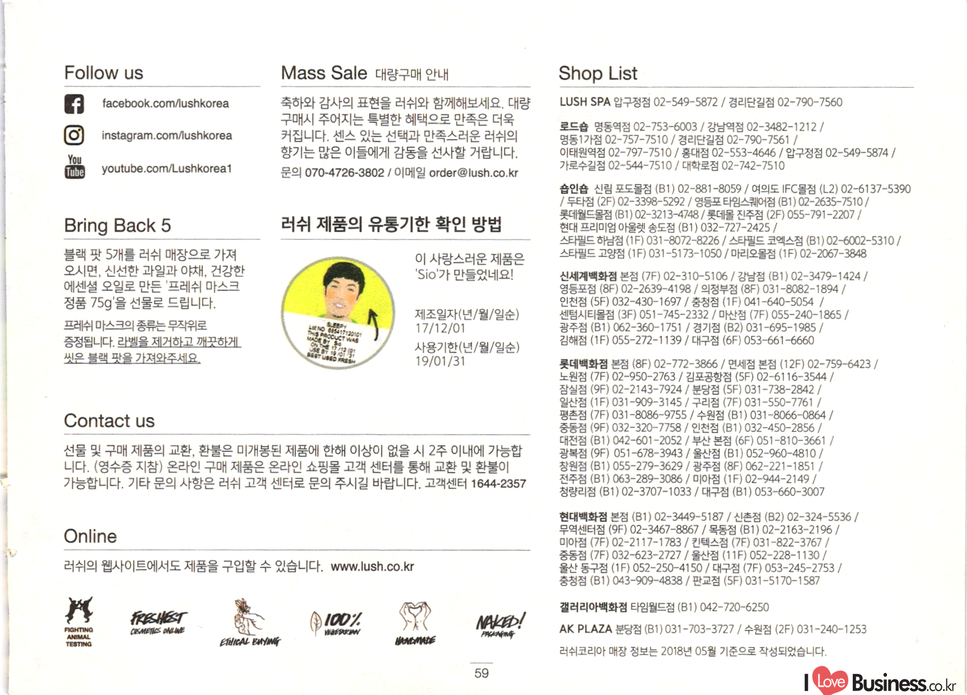 Follow us 대량구매 안내 Shop List facebook.com/lushkorea LUSH SPA 압구정점 02-549-5872 / 경리단길점 02-790-7560 instagram.com/lushkorea 축하와 감사의 표현을 러쉬와 함께해보세요 대량 구매시 주어지는 특별한 혜택으로 만족은 더욱 커집니다. 센스 있는 선택과 만족스러운 러쉬의 향기는 많은 이들에게 감동을 선사할 거랍니다. 문의 070-4726-3802 / 이메일 order @lush.co.kr 로드숍 명동역점 02-753-6003 / 강남역점 02-3482-1212 / 명동1가점 02-757-7510 / 경리단길점 02-790-7561 / 이태원역점 02-797-7510 / 홍대점 02-553-4646 / 압구정점 02-549-5874 / 가로수길점 02-544-7510 / 대학로점 02-742-7510 1 You Tube youtube.com/Lushkorea1 Bring Back 5 러쉬 제품의 유통기한 확인 방법 블랙 팟 5개를 러쉬 매장으로 가져 오시면, 신선한 과일과 야채, 건강한 에센셜 오일로 만든 '프레쉬 마스크 정품 75g'을 선물로 드립니다. 이 사랑스러운 제품은 'Sio'가 만들었네요! 1912001 PAS 프레쉬 마스크의 종류는 무작위로 증정됩니다. 라벨을 제거하고 깨끗하게 씻은 블랙 팟을 가져와주세요. 제조일자(년/월/일순) 17/12/01 사용기한(년/월/일순) 19/01/31 숍인숍 신림 포도몰점 (B1) 02-881-8059 / 여의도 IFC몰점 (L2) 02-6137-5390 | 두타점 (2F) 02-3398-5292 / 영등포 타임스퀘어점 (B1) 02-2635-7510 / 롯데월드몰점 (B1) 02-3213-4748 / 롯데몰 진주점 (2F) 055-791-2207 | 현대 프리미엄 아울렛 송도점 (B1) 032-727-2425 / 스타필드 하남점 (1F) 031-8072-8226 / 스타필드 코엑스점 (B1) 02-6002-5310 / 스타필드 고양점 (1F) 031-5173-1050 / 마리오몰점 (1F) 02-2067-3848 신세계백화점 본점 (7F) 02-310-5106 / 강남점 (B1) 02-3479-1424 / 영등포점 (8F) 02-2639-4198 / 의정부점 (8F) 031-8082-1894 / 인천점 (5F) 032-430~1697 | 충청점 (1F) 041-640-5054 7 센텀시티몰점 (3F) 051-745-2332 / 마산점 (7F) 055-240~1865 / 광주점 (B1) 062-360~1751 / 경기점 (B2) 031-695-1985 / 김해점 (1F) 055-272-1139 | 대구점 (6F) 053-661-6660 롯데백화점 본점 (8F) 02-772-3866 / 면세점 본점 (125) 02-759-6423 / 노원점 (7F) 02-950-2763 / 김포공항점 (5F) 02-6116-3544 / 잠실점 (9F) 02-2143-7924 / 분당점 (5F) 031-738-2842 / 일산점 (1F) 031-909-3145 / 구리점 (7F) 031-550-7761 / 평촌점 (7F) 031-8086-9755 / 수원점 (B1) 031-8066-0864 / 중동점 (9F) 032-320~7758 / 인천점 (B1) 032-450~2856 / 대전점 (B1) 042-601-2052 / 부산 본점 (6F) 051-810-3661 / 광복점 (9F) 051-678-3943 / 울산점 (B1) 052-960-4810 / 창원점 (B1) 055-279-3629 | 광주점 (8F) 062-221-1851 / 전주점 (B1) 063-289-3086 / 미아점 (1F) 02-944-2149 | 청량리점 (B1) 02-3707-1033 / 대구점 (B1) 053-660~3007 Contact us 선물 및 구매 제품의 교환, 환불은 미개봉된 제품에 한해 이상이 없을 시 2주 이내에 가능합 니다. (영수증 지참) 온라인 구매 제품은 온라인 쇼핑몰 고객 센터를 통해 교환 및 환불이 가능합니다. 기타 문의 사항은 러쉬 고객 센터로 문의 주시길 바랍니다. 고객센터 1644-2357 Online 러쉬의 웹사이트에서도 제품을 구입할 수 있습니다. www.lush.co.kr 현대백화점 본점 (B1) 02-3449-5187 / 신촌점 (B2) 02-324-5536 / 무역센터점 (9F) 02-3467-8867 | 목동점 (B1) 02-2163-2196 / 미아점 (7F) 02-2117-1783 / 킨텍스점 (7F) 031-822-3767 / 중동점 (7F) 032-623-2727 / 울산점 (11F) 052-228-1130 / 울산 동구점 (1F) 052-250-4150 / 대구점 (7F) 053-245-2753 / 충청점 (B1) 043-909-4838 / 판교점 (5F) 031-5170~1587 FREHEST ICO. NAKED! CKMEIS ON WE FIGHTING ANIMAL TESTING | ETHICAL BUYNH 갤러리아백화점 타임월드점 (B1) 042-720-6250 AK PLAZA 분당점 (B1) 031-703-3727 / 수원점 (2F) 031-240-1253 러쉬코리아 매장 정보는 2018년 05월 기준으로 작성되었습니다. 69