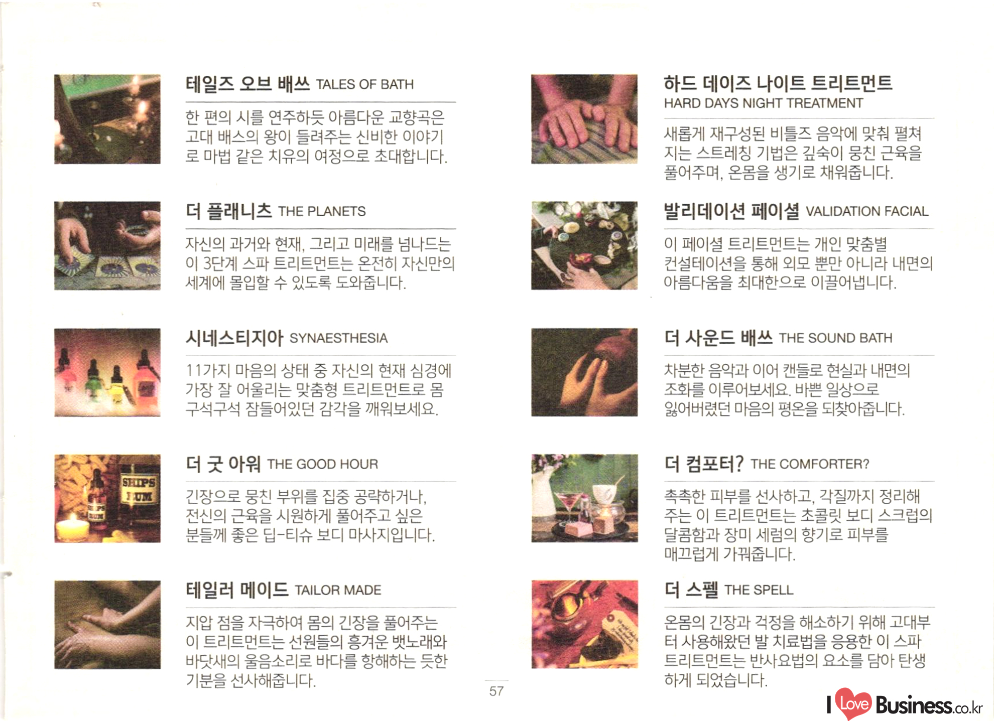 테일즈 오브 배쓰 TALES OF BATH 하드 데이즈 나이트 트리트먼트 HARD DAYS NIGHT TREATMENT 한 편의 시를 연주하듯 아름다운 교향곡은 고대 배스의 왕이 들려주는 신비한 이야기 로 마법 같은 치유의 여정으로 초대합니다. 새롭게 재구성된 비틀즈 음악에 맞춰 펼쳐 지는 스트레칭 기법은 깊숙이 뭉친 근육을 풀어주며, 온몸을 생기로 채워줍니다. 발리데이션 페이셜 VALIDATION FACIAL 더 플래니츠 THE PLANETS 자신의 과거와 현재, 그리고 미래를 넘나드는 이 3단계 스파 트리트먼트는 온전히 자신만의 세계에 몰입할 수 있도록 도와줍니다. 이 페이셜 트리트먼트는 개인 맞춤별 컨설테이션을 통해 외모 뿐만 아니라 내면의 아름다움을 최대한으로 이끌어냅니다. 더 사운드 배쓰 THE SOUND BATH 시네스티지아 SYNAESTHESIA 11가지 마음의 상태 중 자신의 현재 심경에 가장 잘 어울리는 맞춤형 트리트먼트로 몸 구석구석 잠들어있던 감각을 깨워보세요. 차분한 음악과 이어 캔들로 현실과 내면의 조화를 이루어보세요. 바쁜 일상으로 잃어버렸던 마음의 평온을 되찾아줍니다. SEUPS SEUM 더 굿 아워 THE GOOD HOUR 긴장으로 뭉친 부위를 집중 공략하거나, 전신의 근육을 시원하게 풀어주고 싶은 분들께 좋은 딥티슈 보디 마사지입니다. 더 컴포터? THE COMFORTER? 촉촉한 피부를 선사하고, 각질까지 정리해 주는 이 트리트먼트는 초콜릿 보디 스크럽의 달콤함과 장미 세럼의 향기로 피부를 매끄럽게 가꿔줍니다. 테일러 메이드 TAILOR MADE 더 스펠 THE SPELL 지압 점을 자극하여 몸의 긴장을 풀어주는 이 트리트먼트는 선원들의 흥겨운 뱃노래와 바닷새의 울음소리로 바다를 항해하는 듯한 기분을 선사해줍니다. 온몸의 긴장과 걱정을 해소하기 위해 고대부 터 사용해왔던 발 치료법을 응용한 이 스파 트리트먼트는 반사요법의 요소를 담아 탄생 하게 되었습니다. 57