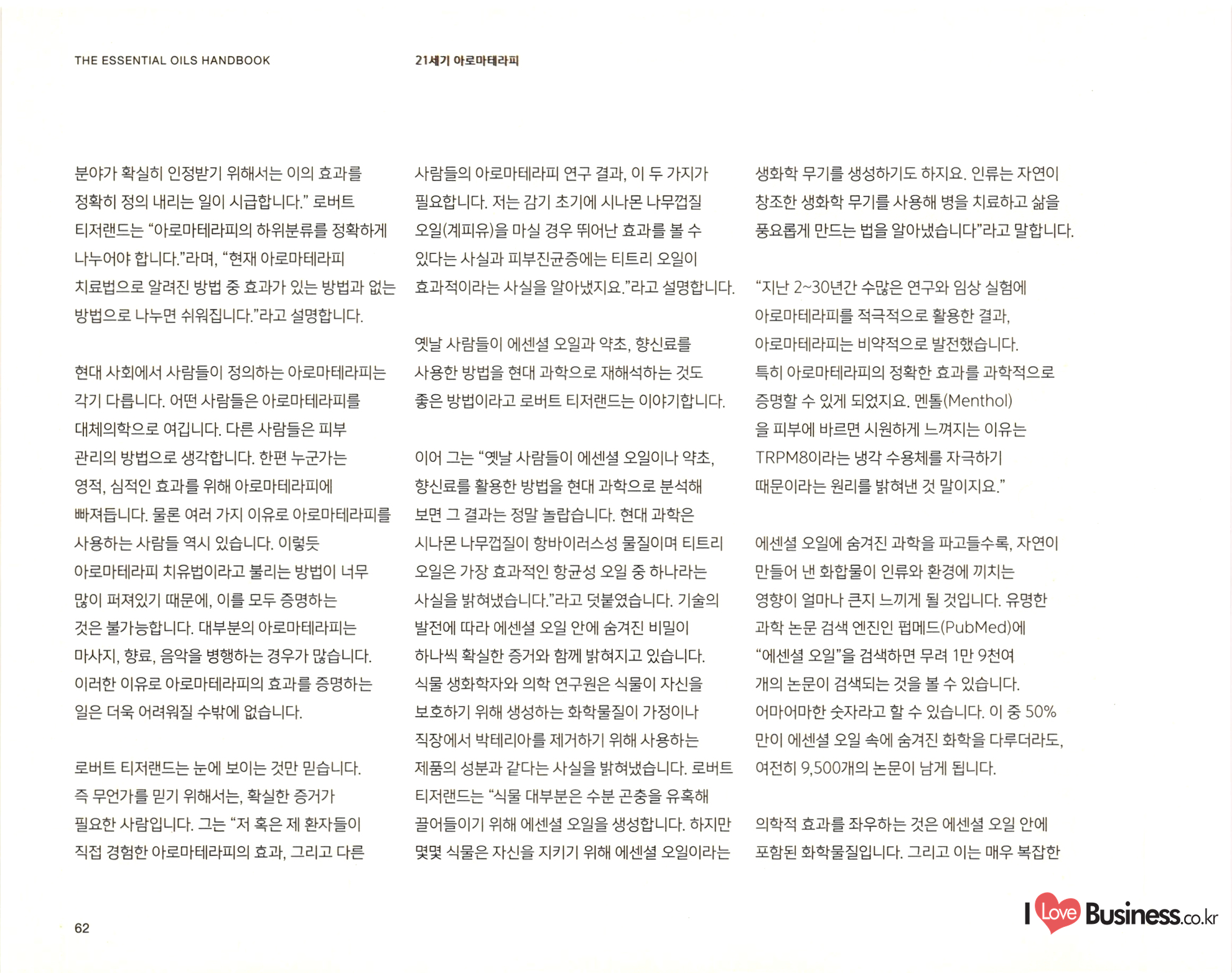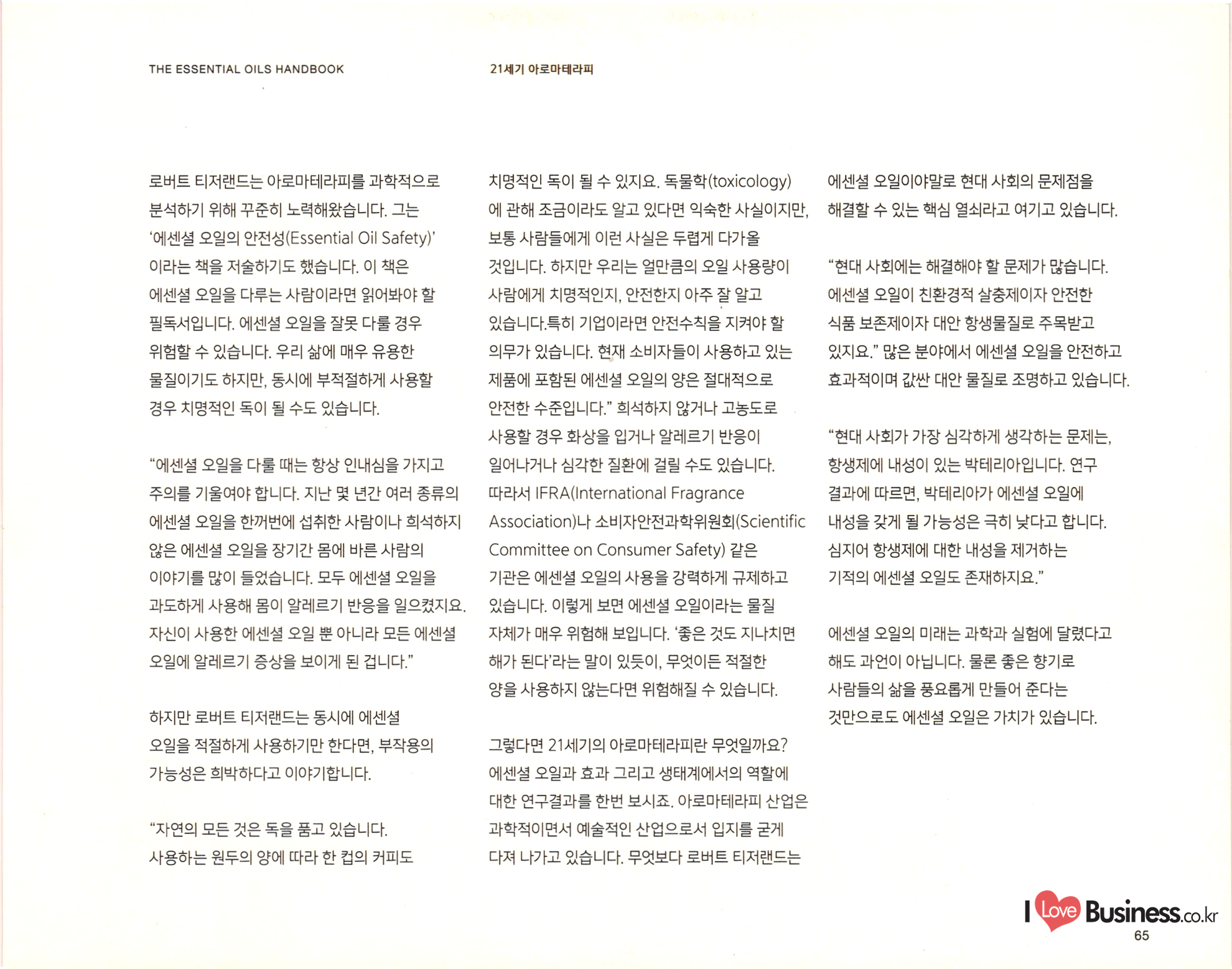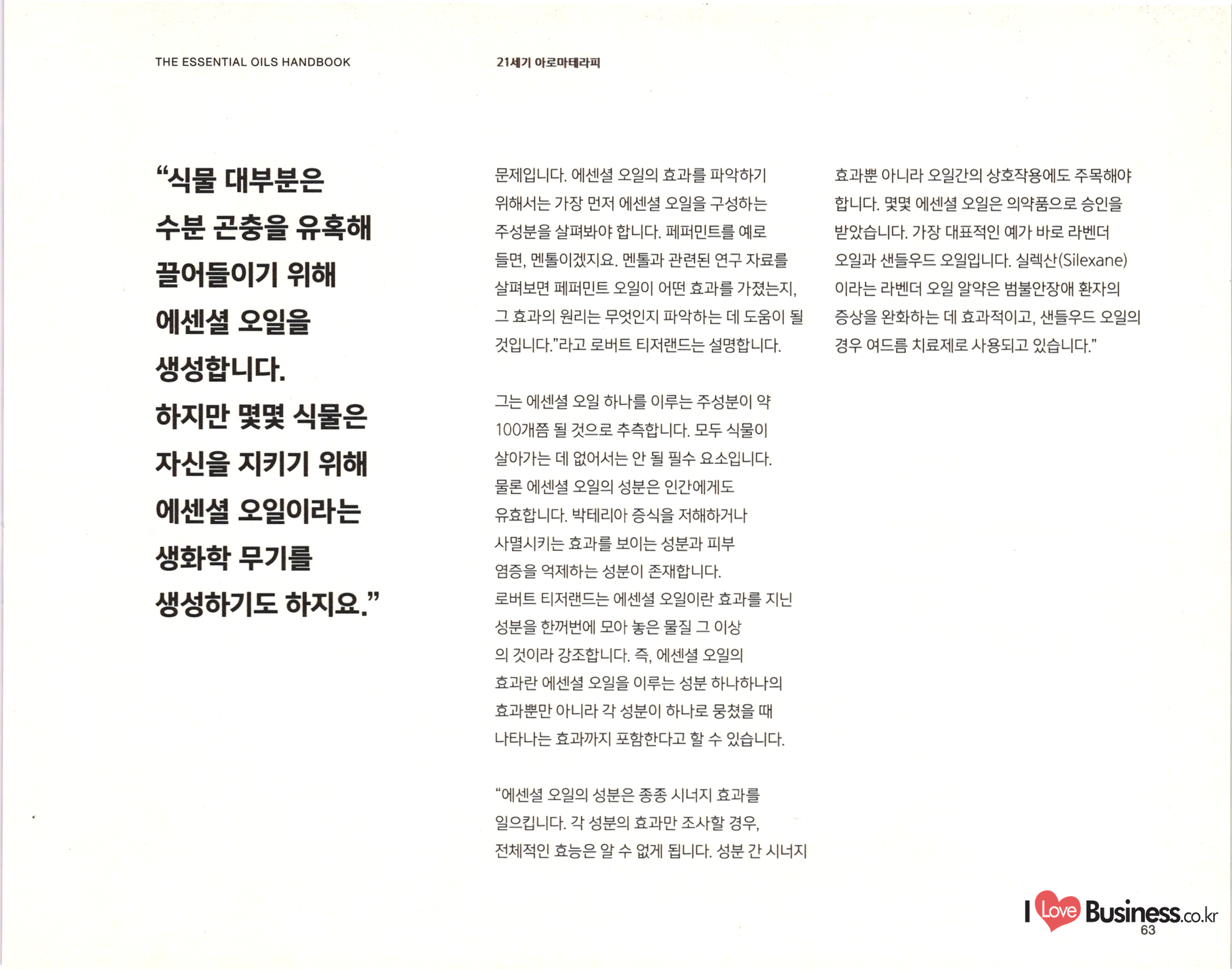 THE ESSENTIAL OILS HANDBOOK 태초의 향기 치유를 통한 건강한 삶: 힐링과 웰빙, 그리고 에센셜 오일 사람들은 예전부터 몸과 마음, 영혼의 건강을 이후 에센셜 오일과 마사지를 접목해 지친 위해 에센셜 오일을 사용하고 있습니다. 하지만 몸과 마음을 회복하려는 시도는 꾸준히 '아로마테라피'라는 단어가 등장한 것은 비교적 인기를 끌었습니다. 현존하는 아로마테라피와 최근의 일입니다. 20세기 초 프랑스의 의사 관련된 수업과 책, 매체의 숫자는 셀 수 없을 겸 과학자인 르네 모리스 가테포세(Rene 지경입니다. 아로마테라피 전문가도 그만큼 Maurice Gattefosse)가 바로 아로마테라피라는 . 늘어났습니다. 하지만 그만큼 아로마테라피에 단어를 만든 창시자입니다. 가테포세는 어느 날 대한 정확한 원리와 지식은 얻기 힘들어졌지요. 연구실에서 일어난 작은 사고로 손에 화상을 입게 아로마테라피는 이제 수많은 신념과 믿음을 되었습니다. 그는 급한 마음에 라벤더 오일이 | 아우르는 포괄적인 단어가 되어버렸습니다. 가득 담긴 통에 손을 담갔고, 그로 인해 라벤더 오일이 놀라운 피부 진정 효과를 가지고 있다는 사실을 깨닫게 되었습니다. | 어떤 이들은 에센셜 오일은 그저 기분을 좋게 혹은 나쁘게 만들 수 있을 정도의 효과를 가졌다고 | 주장합니다. 어떤 이들은 에센셜 오일은 그보다 큰 힘을 지녔다고 주장하지요. 아로마테라피야 말로 모든 병을 고칠 수 있는 대체 의학이라고 믿고 있는 사람들도 존재합니다. 그중 무엇이 진실이든, 에센셜 오일은 오랫동안 사람들의 몸과 마음, 영혼을 어루만져 왔습니다. 현재에 이르러서는 다양한 산업에서 활용되고 있지요. | Love Business.co.kr 26 출처: https://richcat.tistory.com/9823 [리치캣의 현재 그리고 미래]