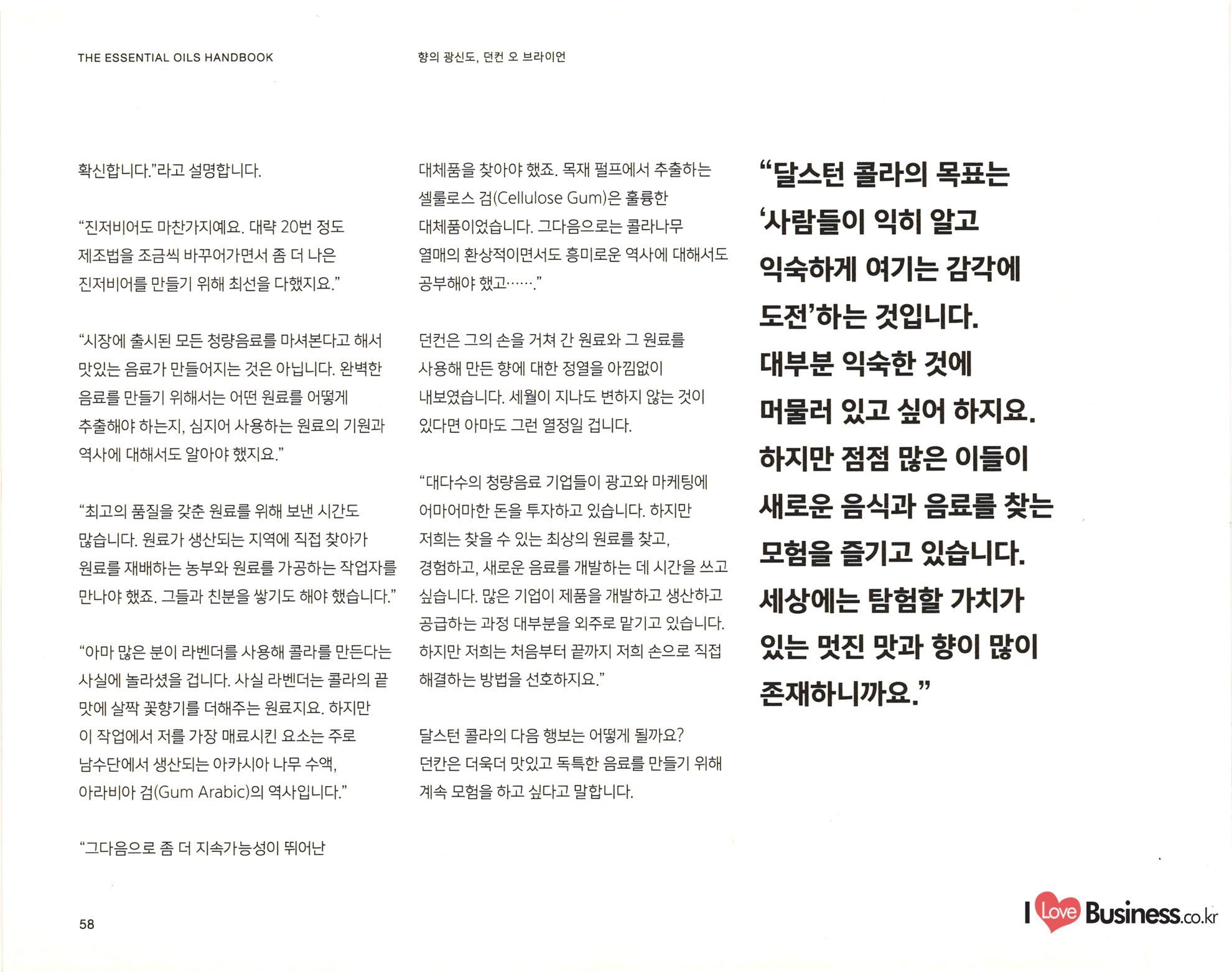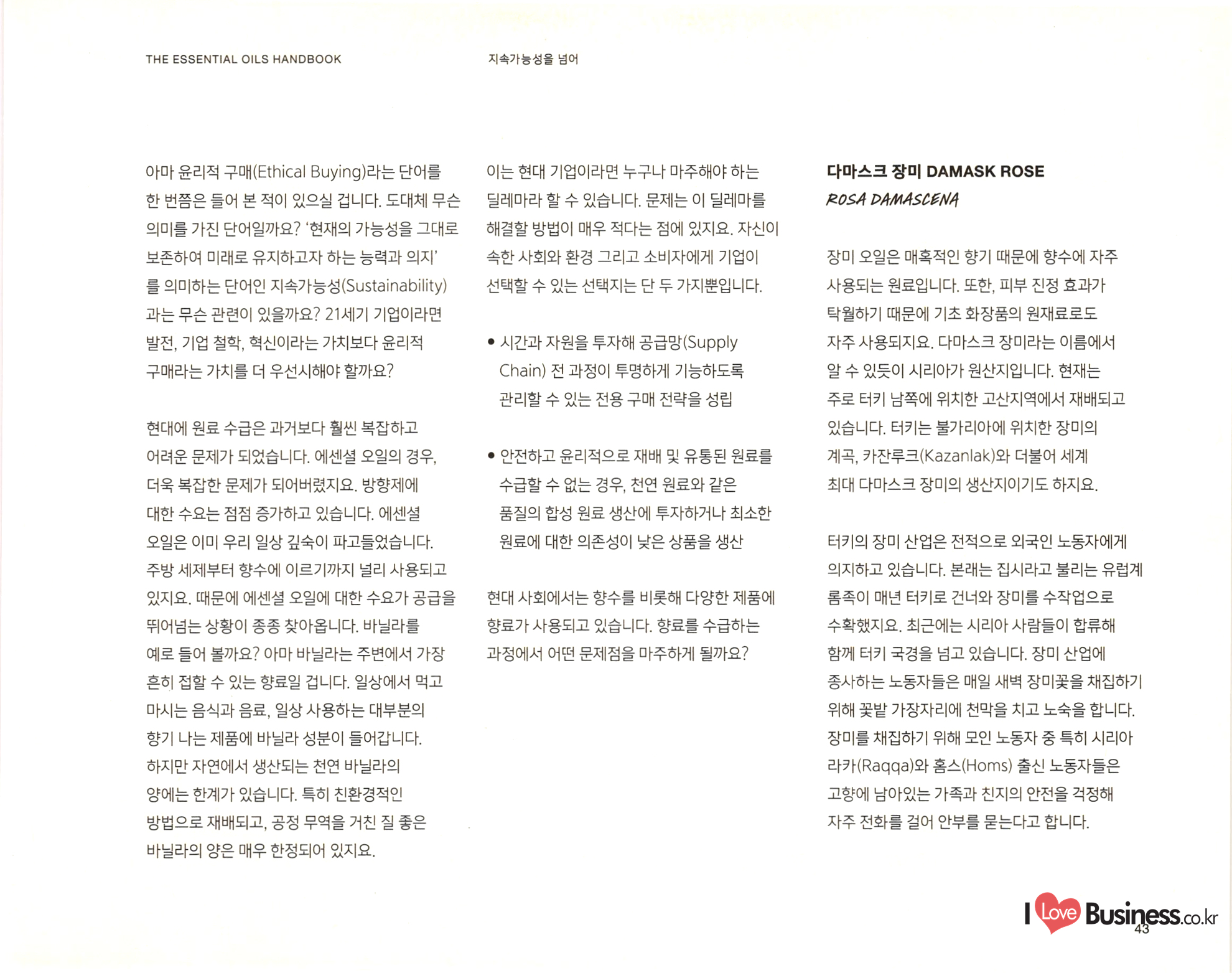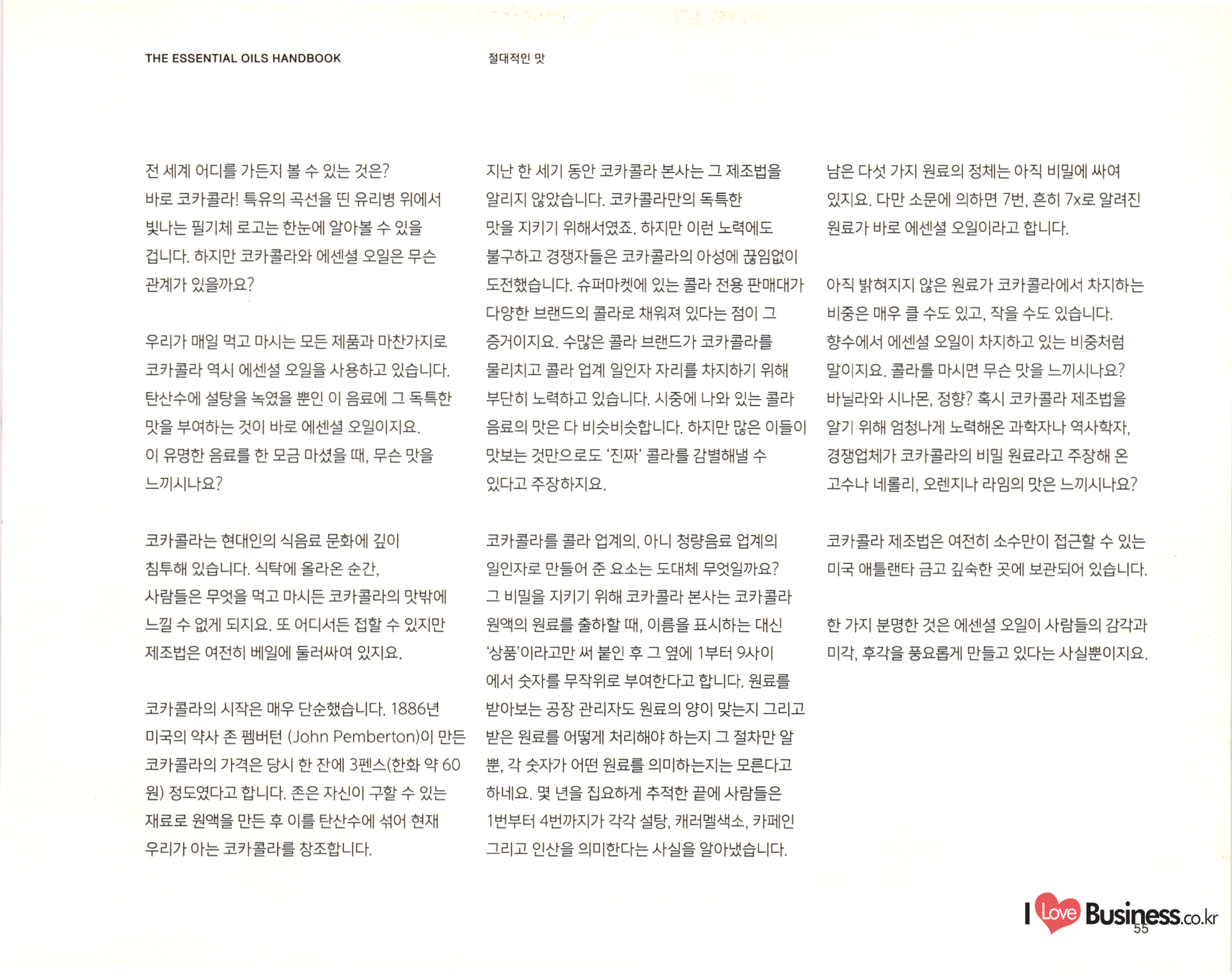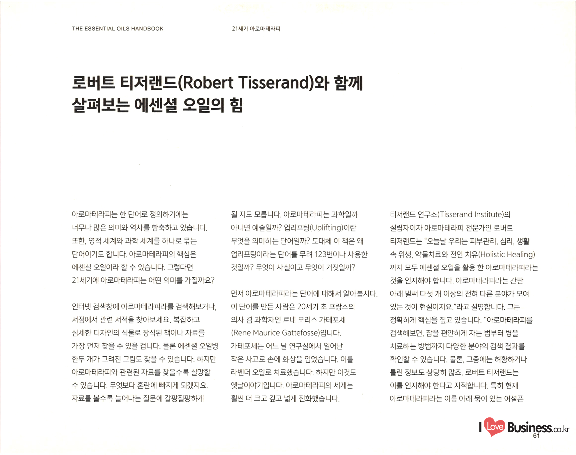 THE ESSENTIAL OILS HANDBOOK 태초의 향기 치유를 통한 건강한 삶: 힐링과 웰빙, 그리고 에센셜 오일 사람들은 예전부터 몸과 마음, 영혼의 건강을 이후 에센셜 오일과 마사지를 접목해 지친 위해 에센셜 오일을 사용하고 있습니다. 하지만 몸과 마음을 회복하려는 시도는 꾸준히 '아로마테라피'라는 단어가 등장한 것은 비교적 인기를 끌었습니다. 현존하는 아로마테라피와 최근의 일입니다. 20세기 초 프랑스의 의사 관련된 수업과 책, 매체의 숫자는 셀 수 없을 겸 과학자인 르네 모리스 가테포세(Rene 지경입니다. 아로마테라피 전문가도 그만큼 Maurice Gattefosse)가 바로 아로마테라피라는 . 늘어났습니다. 하지만 그만큼 아로마테라피에 단어를 만든 창시자입니다. 가테포세는 어느 날 대한 정확한 원리와 지식은 얻기 힘들어졌지요. 연구실에서 일어난 작은 사고로 손에 화상을 입게 아로마테라피는 이제 수많은 신념과 믿음을 되었습니다. 그는 급한 마음에 라벤더 오일이 | 아우르는 포괄적인 단어가 되어버렸습니다. 가득 담긴 통에 손을 담갔고, 그로 인해 라벤더 오일이 놀라운 피부 진정 효과를 가지고 있다는 사실을 깨닫게 되었습니다. | 어떤 이들은 에센셜 오일은 그저 기분을 좋게 혹은 나쁘게 만들 수 있을 정도의 효과를 가졌다고 | 주장합니다. 어떤 이들은 에센셜 오일은 그보다 큰 힘을 지녔다고 주장하지요. 아로마테라피야 말로 모든 병을 고칠 수 있는 대체 의학이라고 믿고 있는 사람들도 존재합니다. 그중 무엇이 진실이든, 에센셜 오일은 오랫동안 사람들의 몸과 마음, 영혼을 어루만져 왔습니다. 현재에 이르러서는 다양한 산업에서 활용되고 있지요. | Love Business.co.kr 26 출처: https://richcat.tistory.com/9823 [리치캣의 현재 그리고 미래]