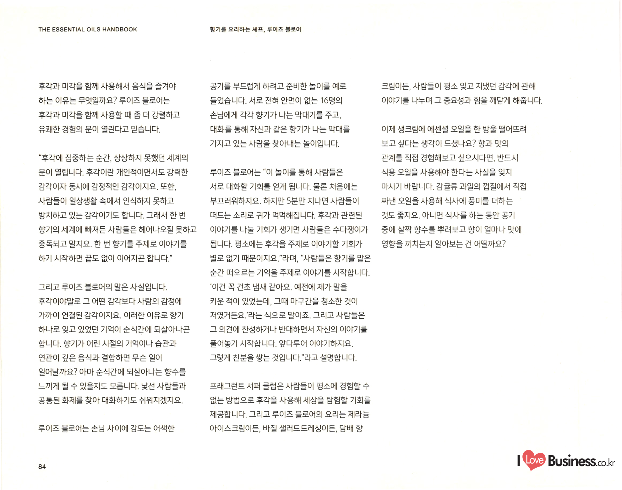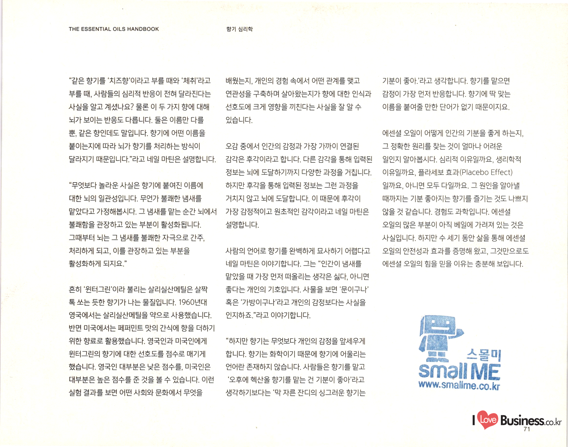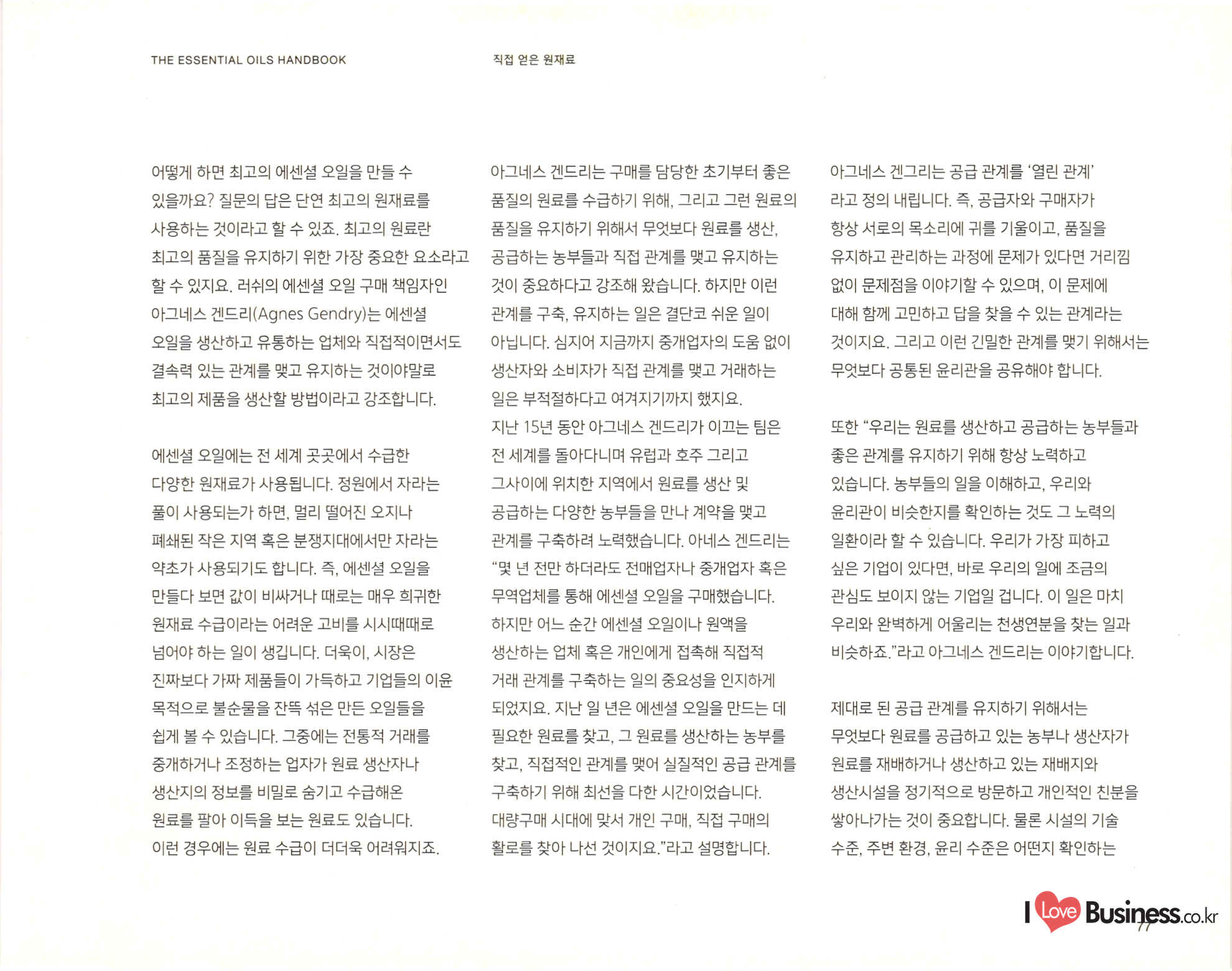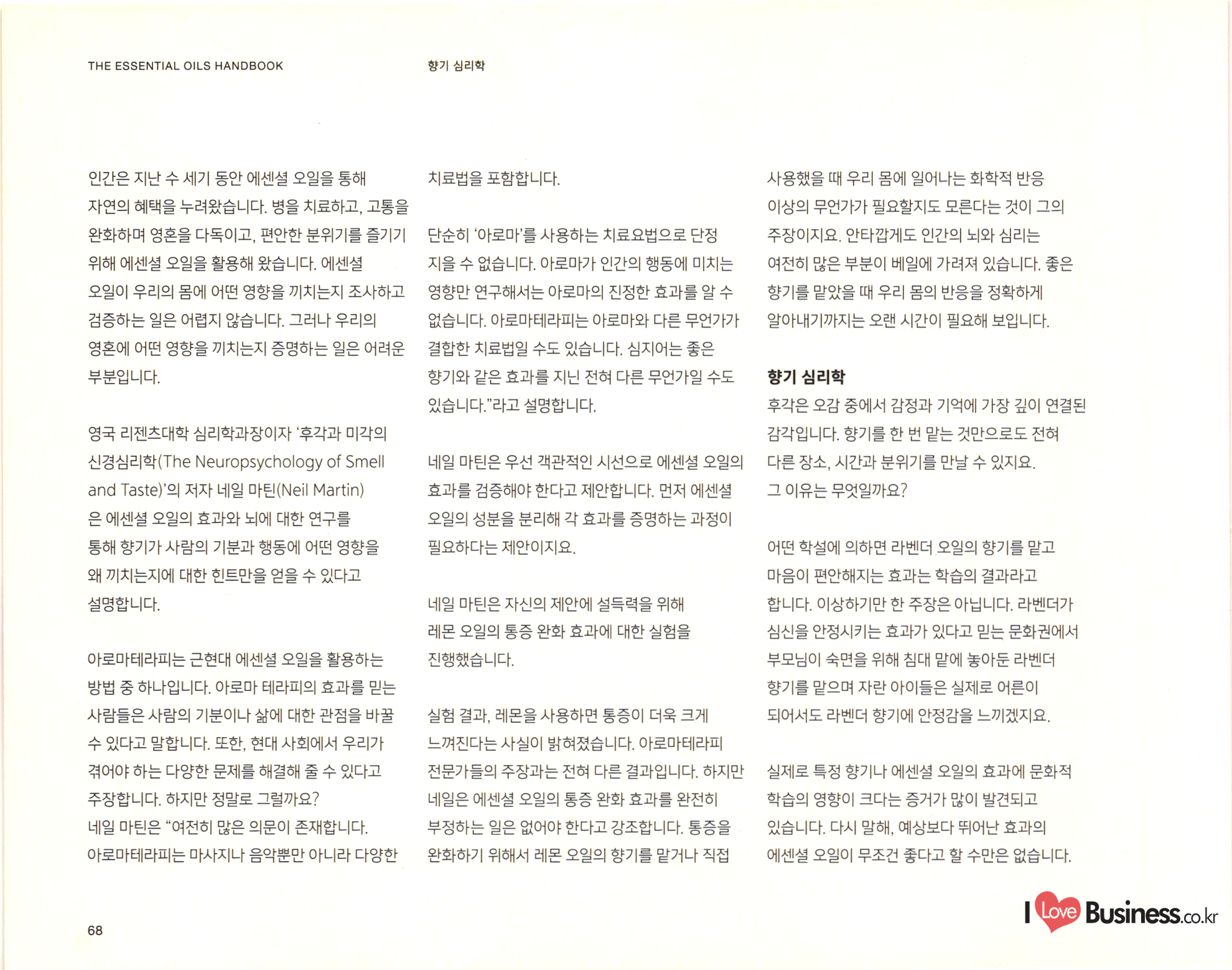 THE ESSENTIAL OILS HANDBOOK 태초의 향기 치유를 통한 건강한 삶: 힐링과 웰빙, 그리고 에센셜 오일 사람들은 예전부터 몸과 마음, 영혼의 건강을 이후 에센셜 오일과 마사지를 접목해 지친 위해 에센셜 오일을 사용하고 있습니다. 하지만 몸과 마음을 회복하려는 시도는 꾸준히 '아로마테라피'라는 단어가 등장한 것은 비교적 인기를 끌었습니다. 현존하는 아로마테라피와 최근의 일입니다. 20세기 초 프랑스의 의사 관련된 수업과 책, 매체의 숫자는 셀 수 없을 겸 과학자인 르네 모리스 가테포세(Rene 지경입니다. 아로마테라피 전문가도 그만큼 Maurice Gattefosse)가 바로 아로마테라피라는 . 늘어났습니다. 하지만 그만큼 아로마테라피에 단어를 만든 창시자입니다. 가테포세는 어느 날 대한 정확한 원리와 지식은 얻기 힘들어졌지요. 연구실에서 일어난 작은 사고로 손에 화상을 입게 아로마테라피는 이제 수많은 신념과 믿음을 되었습니다. 그는 급한 마음에 라벤더 오일이 | 아우르는 포괄적인 단어가 되어버렸습니다. 가득 담긴 통에 손을 담갔고, 그로 인해 라벤더 오일이 놀라운 피부 진정 효과를 가지고 있다는 사실을 깨닫게 되었습니다. | 어떤 이들은 에센셜 오일은 그저 기분을 좋게 혹은 나쁘게 만들 수 있을 정도의 효과를 가졌다고 | 주장합니다. 어떤 이들은 에센셜 오일은 그보다 큰 힘을 지녔다고 주장하지요. 아로마테라피야 말로 모든 병을 고칠 수 있는 대체 의학이라고 믿고 있는 사람들도 존재합니다. 그중 무엇이 진실이든, 에센셜 오일은 오랫동안 사람들의 몸과 마음, 영혼을 어루만져 왔습니다. 현재에 이르러서는 다양한 산업에서 활용되고 있지요. | Love Business.co.kr 26