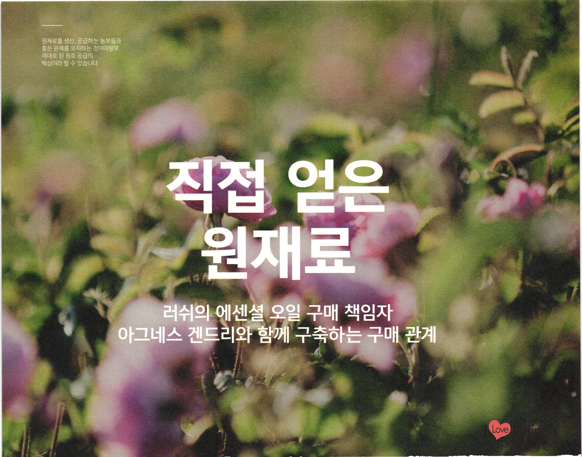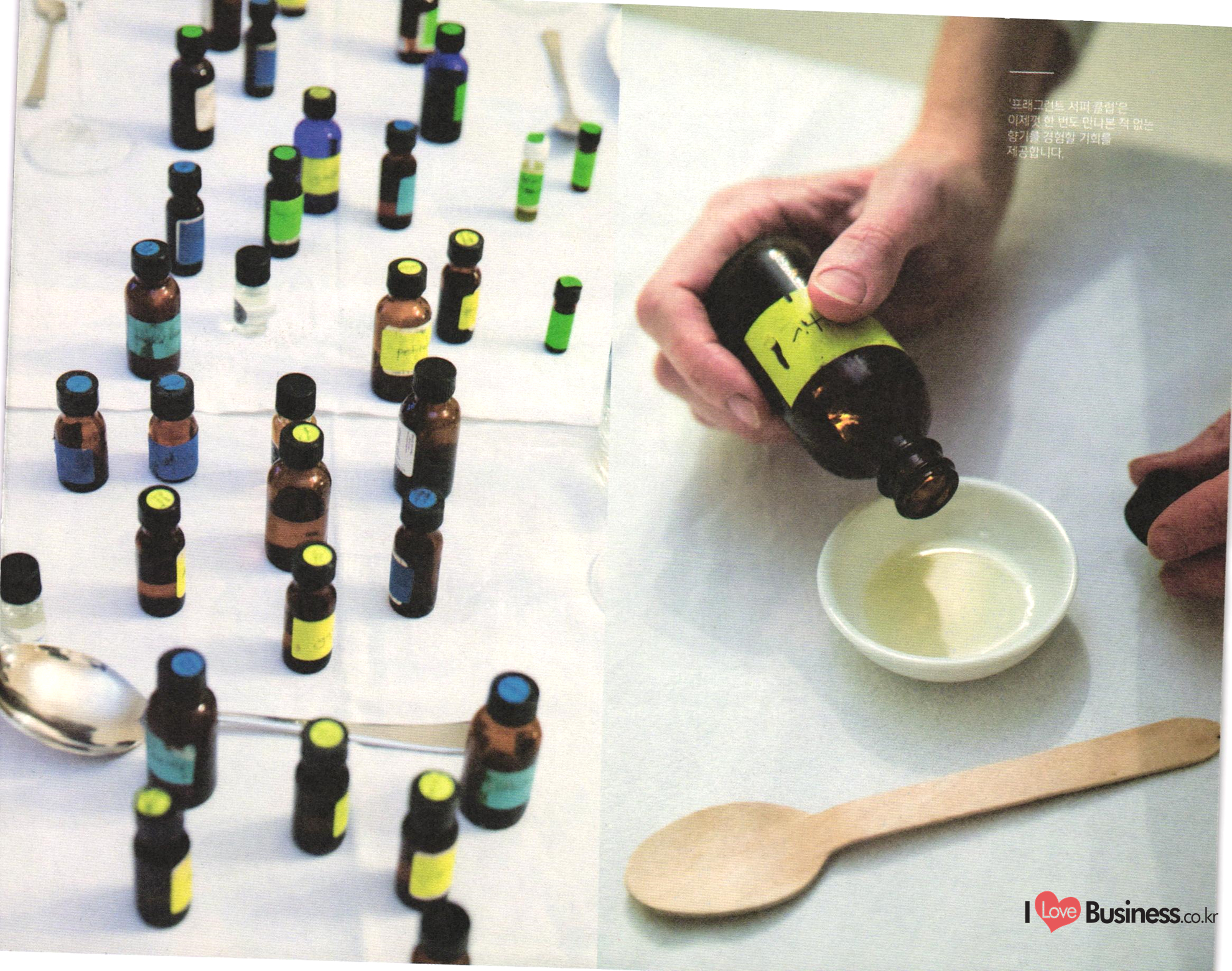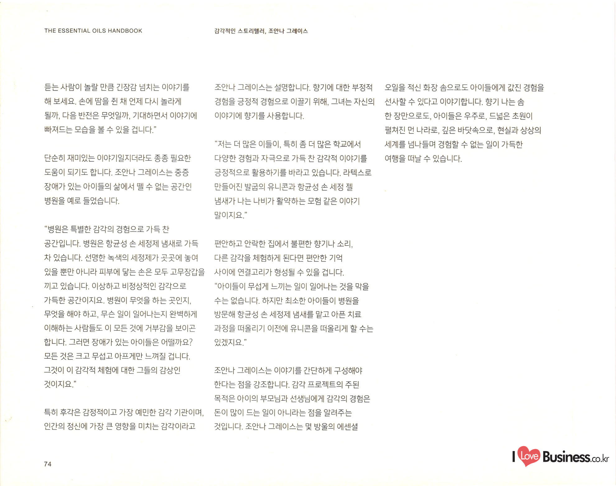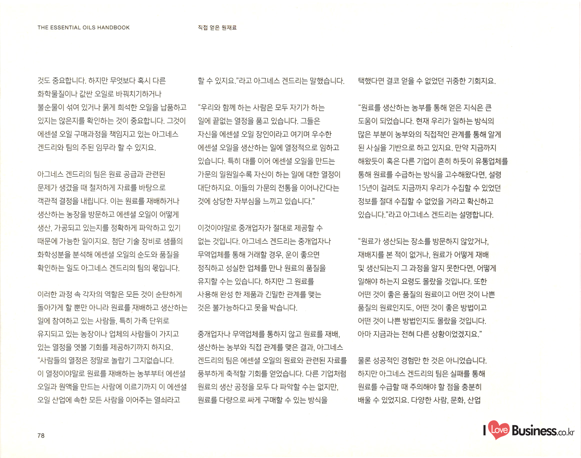 THE ESSENTIAL OILS HANDBOOK 태초의 향기 치유를 통한 건강한 삶: 힐링과 웰빙, 그리고 에센셜 오일 사람들은 예전부터 몸과 마음, 영혼의 건강을 이후 에센셜 오일과 마사지를 접목해 지친 위해 에센셜 오일을 사용하고 있습니다. 하지만 몸과 마음을 회복하려는 시도는 꾸준히 '아로마테라피'라는 단어가 등장한 것은 비교적 인기를 끌었습니다. 현존하는 아로마테라피와 최근의 일입니다. 20세기 초 프랑스의 의사 관련된 수업과 책, 매체의 숫자는 셀 수 없을 겸 과학자인 르네 모리스 가테포세(Rene 지경입니다. 아로마테라피 전문가도 그만큼 Maurice Gattefosse)가 바로 아로마테라피라는 . 늘어났습니다. 하지만 그만큼 아로마테라피에 단어를 만든 창시자입니다. 가테포세는 어느 날 대한 정확한 원리와 지식은 얻기 힘들어졌지요. 연구실에서 일어난 작은 사고로 손에 화상을 입게 아로마테라피는 이제 수많은 신념과 믿음을 되었습니다. 그는 급한 마음에 라벤더 오일이 | 아우르는 포괄적인 단어가 되어버렸습니다. 가득 담긴 통에 손을 담갔고, 그로 인해 라벤더 오일이 놀라운 피부 진정 효과를 가지고 있다는 사실을 깨닫게 되었습니다. | 어떤 이들은 에센셜 오일은 그저 기분을 좋게 혹은 나쁘게 만들 수 있을 정도의 효과를 가졌다고 | 주장합니다. 어떤 이들은 에센셜 오일은 그보다 큰 힘을 지녔다고 주장하지요. 아로마테라피야 말로 모든 병을 고칠 수 있는 대체 의학이라고 믿고 있는 사람들도 존재합니다. 그중 무엇이 진실이든, 에센셜 오일은 오랫동안 사람들의 몸과 마음, 영혼을 어루만져 왔습니다. 현재에 이르러서는 다양한 산업에서 활용되고 있지요. | Love Business.co.kr 26