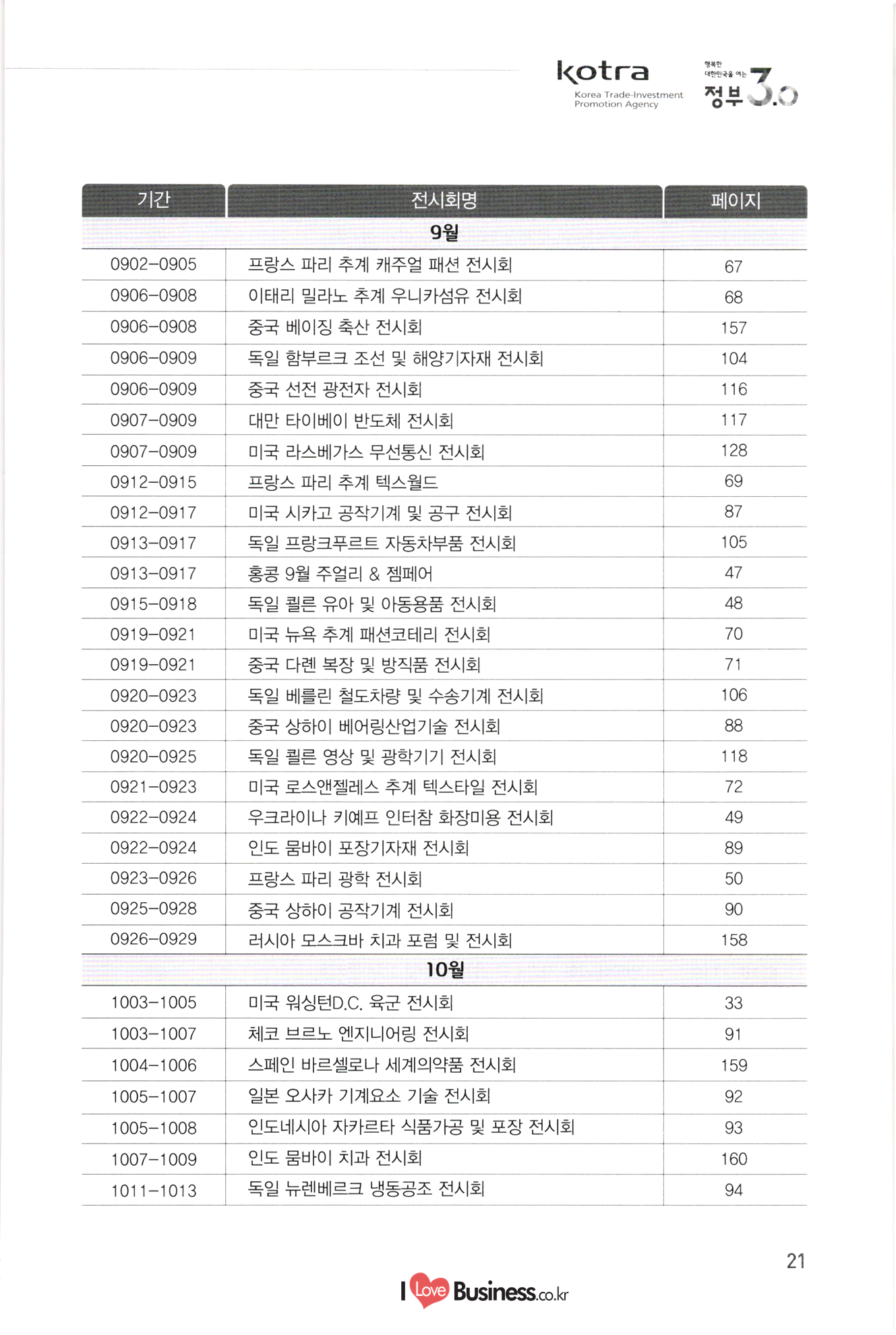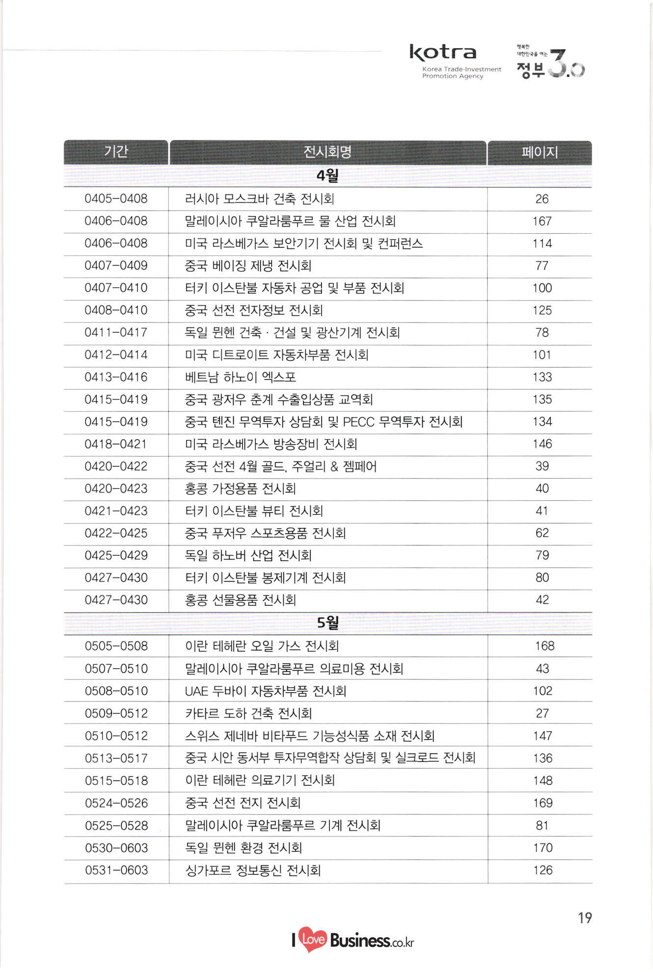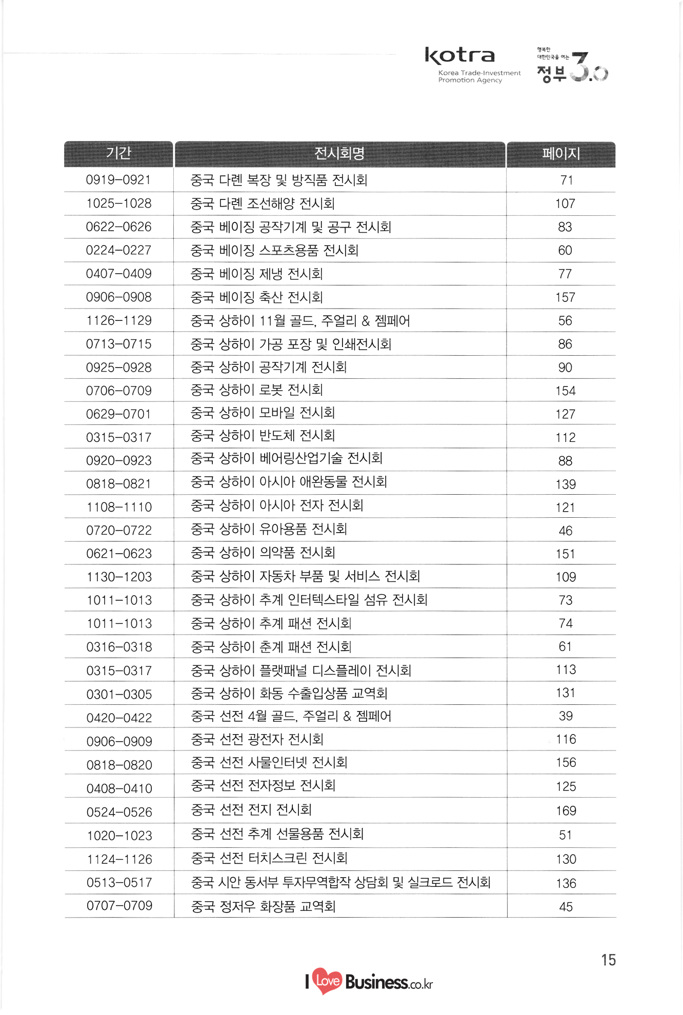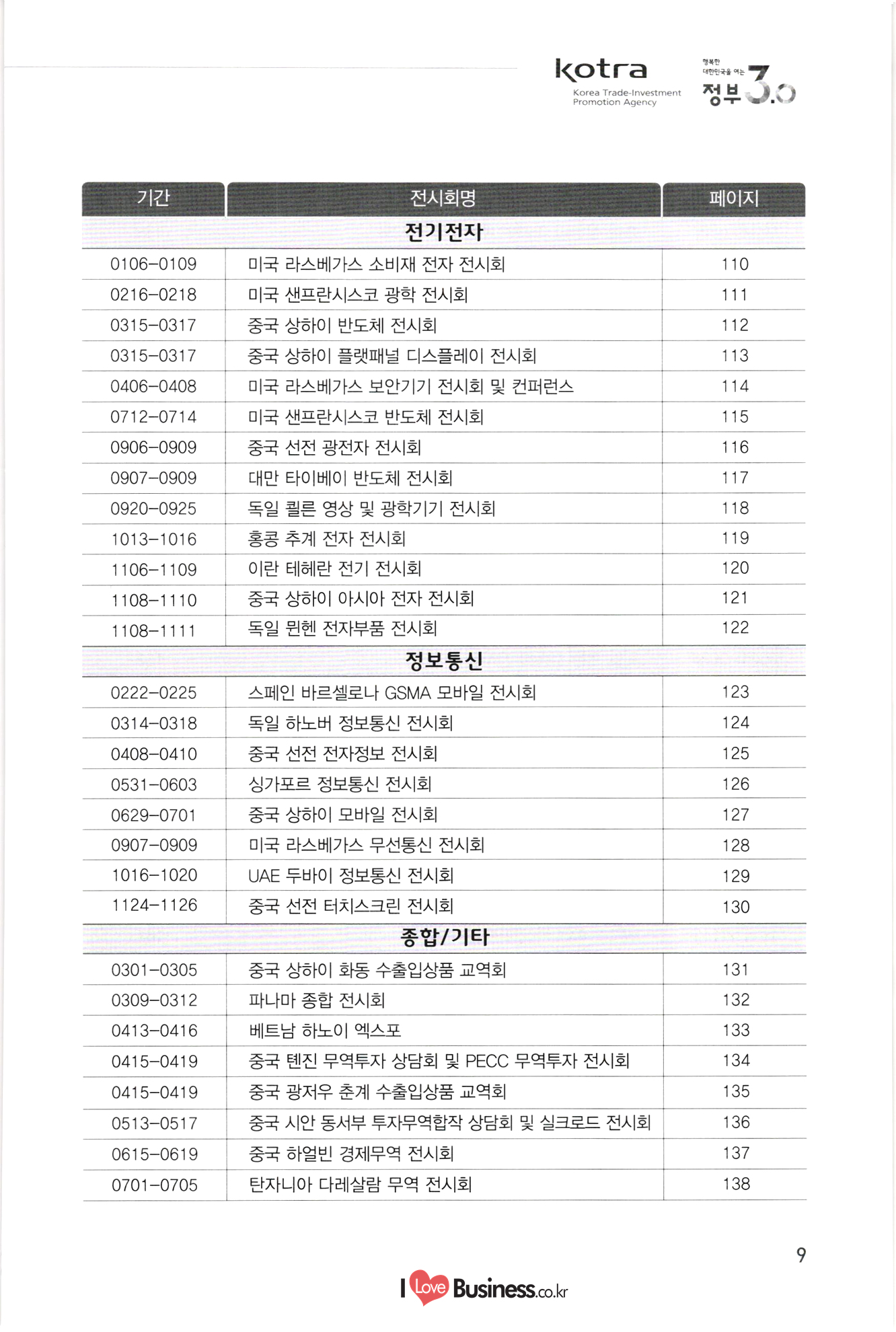 kotra 행복한 대한민국을 여는 Korea Trade-Investment Promotion Agency | 정부 0.0 기간 페이지 110 111 112 113 114 0106-0109 0216-0218 0315-0317 0315-0317 0406-0408 10712-0714 10906-0909 1 0907-0909 0920-0925 1 1013-1016 1106-1109 1108-1110 1108-1111 115 116 117 118 119 120 121 122 전시회명 전기전자 미국 라스베가스 소비재 전자 전시회 미국 샌프란시스코 광학 전시회 중국 상하이 반도체 전시회 중국 상하이 플랫패널 디스플레이 전시회 미국 라스베가스 보안기기 전시회 및 컨퍼런스 미국 샌프란시스코 반도체 전시회 중국 선전 광전자 전시회 대만 타이베이 반도체 전시회 독일 쾰른 영상 및 광학기기 전시회 홍콩 추계 전자 전시회 이란 테헤란 전기 전시회 중국 상하이 아시아 전자 전시회 독일 뮌헨 전자부품 전시회 | 정보통신 스페인 바르셀로나 GSMA 모바일 전시회 독일 하노버 정보통신 전시회 - 중국 선전 전자정보 전시회 싱가포르 정보통신 전시회 중국 상하이 모바일 전시회 미국 라스베가스 무선통신 전시회 UAE 두바이 정보통신 전시회 중국 선전 터치스크린 전시회 종합/기타 중국 상하이 화동 수출입상품 교역회 파나마 종합 전시회 베트남 하노이 엑스포 중국 톈진 무역투자 상담회 및 PECC 무역투자 전시회 중국 광저우 춘계 수출입상품 교역회 중국 시안 동서부 투자무역합작 상담회 및 실크로드 전시회 중국 하얼빈 경제무역 전시회 탄자니아 다레살람 무역 전시회 123 124 125 0222-0225 0314-0318 10408-0410 1 0531-0603 0629-0701 1 0907-0909 1016-1020 1124-1126 126 127 128 129 130 131 132 133 0301-0305 0309-0312 10413-0416 0415-0419 0415-0419 0513-0517 0615-0619 134 135 136 137. 10701-0705 138