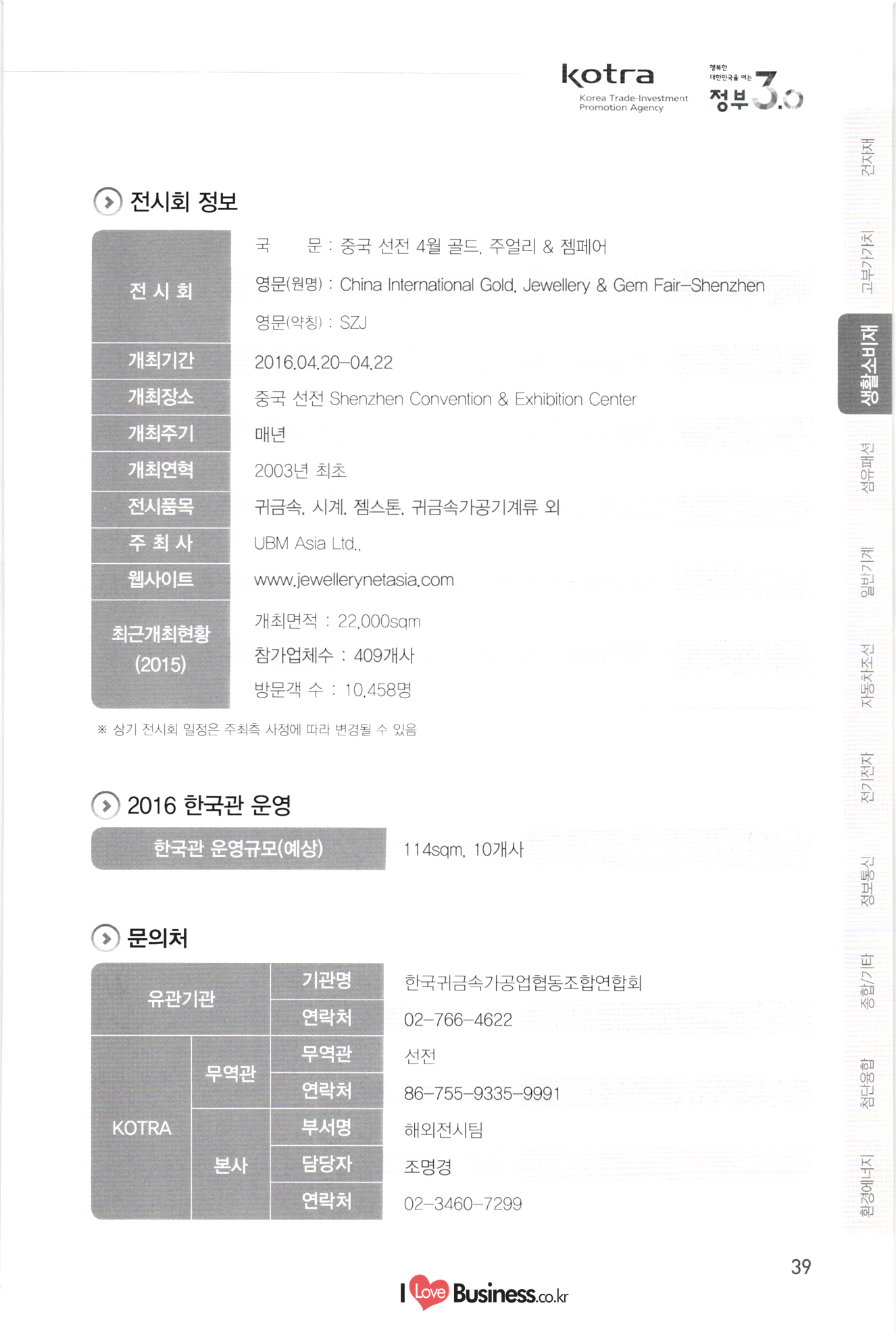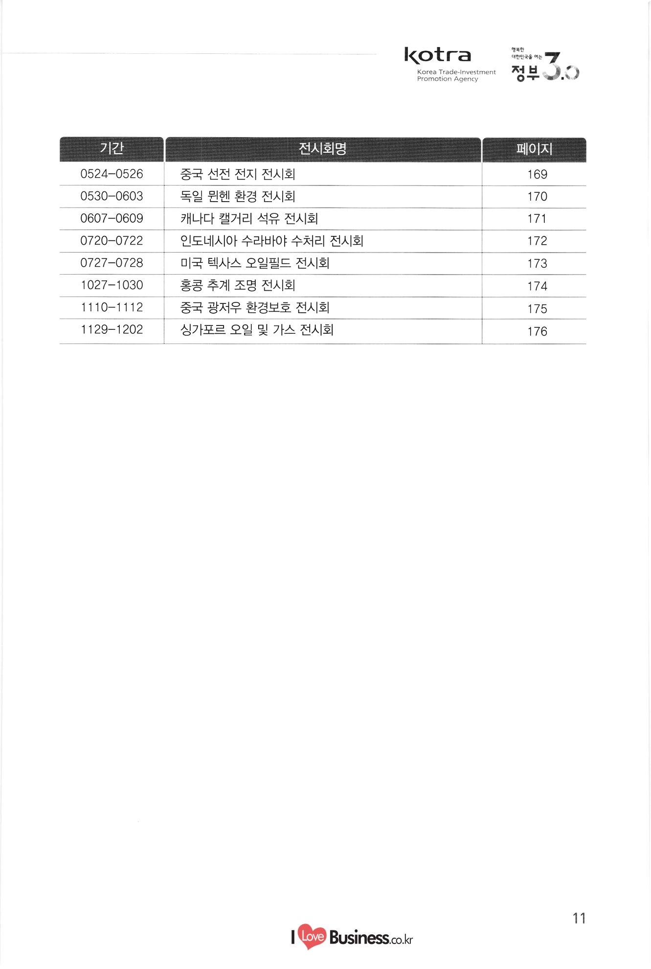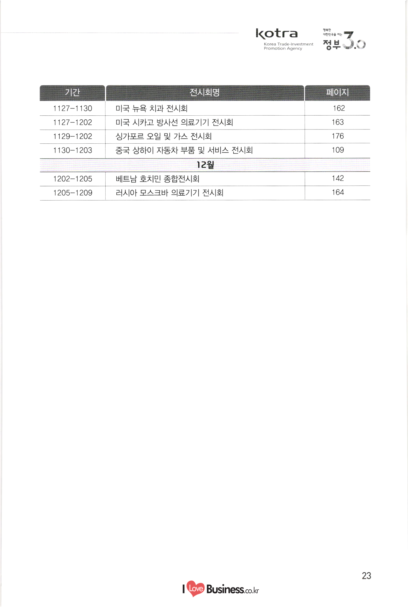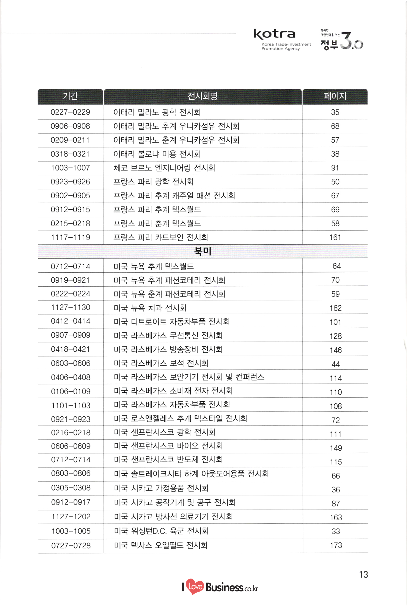 kotra 행복한 대한민국을 여는 Korea Trade-Investment Promotion Agency | 정부 0.0 기간 페이지 110 111 112 113 114 0106-0109 0216-0218 0315-0317 0315-0317 0406-0408 10712-0714 10906-0909 1 0907-0909 0920-0925 1 1013-1016 1106-1109 1108-1110 1108-1111 115 116 117 118 119 120 121 122 전시회명 전기전자 미국 라스베가스 소비재 전자 전시회 미국 샌프란시스코 광학 전시회 중국 상하이 반도체 전시회 중국 상하이 플랫패널 디스플레이 전시회 미국 라스베가스 보안기기 전시회 및 컨퍼런스 미국 샌프란시스코 반도체 전시회 중국 선전 광전자 전시회 대만 타이베이 반도체 전시회 독일 쾰른 영상 및 광학기기 전시회 홍콩 추계 전자 전시회 이란 테헤란 전기 전시회 중국 상하이 아시아 전자 전시회 독일 뮌헨 전자부품 전시회 | 정보통신 스페인 바르셀로나 GSMA 모바일 전시회 독일 하노버 정보통신 전시회 - 중국 선전 전자정보 전시회 싱가포르 정보통신 전시회 중국 상하이 모바일 전시회 미국 라스베가스 무선통신 전시회 UAE 두바이 정보통신 전시회 중국 선전 터치스크린 전시회 종합/기타 중국 상하이 화동 수출입상품 교역회 파나마 종합 전시회 베트남 하노이 엑스포 중국 톈진 무역투자 상담회 및 PECC 무역투자 전시회 중국 광저우 춘계 수출입상품 교역회 중국 시안 동서부 투자무역합작 상담회 및 실크로드 전시회 중국 하얼빈 경제무역 전시회 탄자니아 다레살람 무역 전시회 123 124 125 0222-0225 0314-0318 10408-0410 1 0531-0603 0629-0701 1 0907-0909 1016-1020 1124-1126 126 127 128 129 130 131 132 133 0301-0305 0309-0312 10413-0416 0415-0419 0415-0419 0513-0517 0615-0619 134 135 136 137. 10701-0705 138