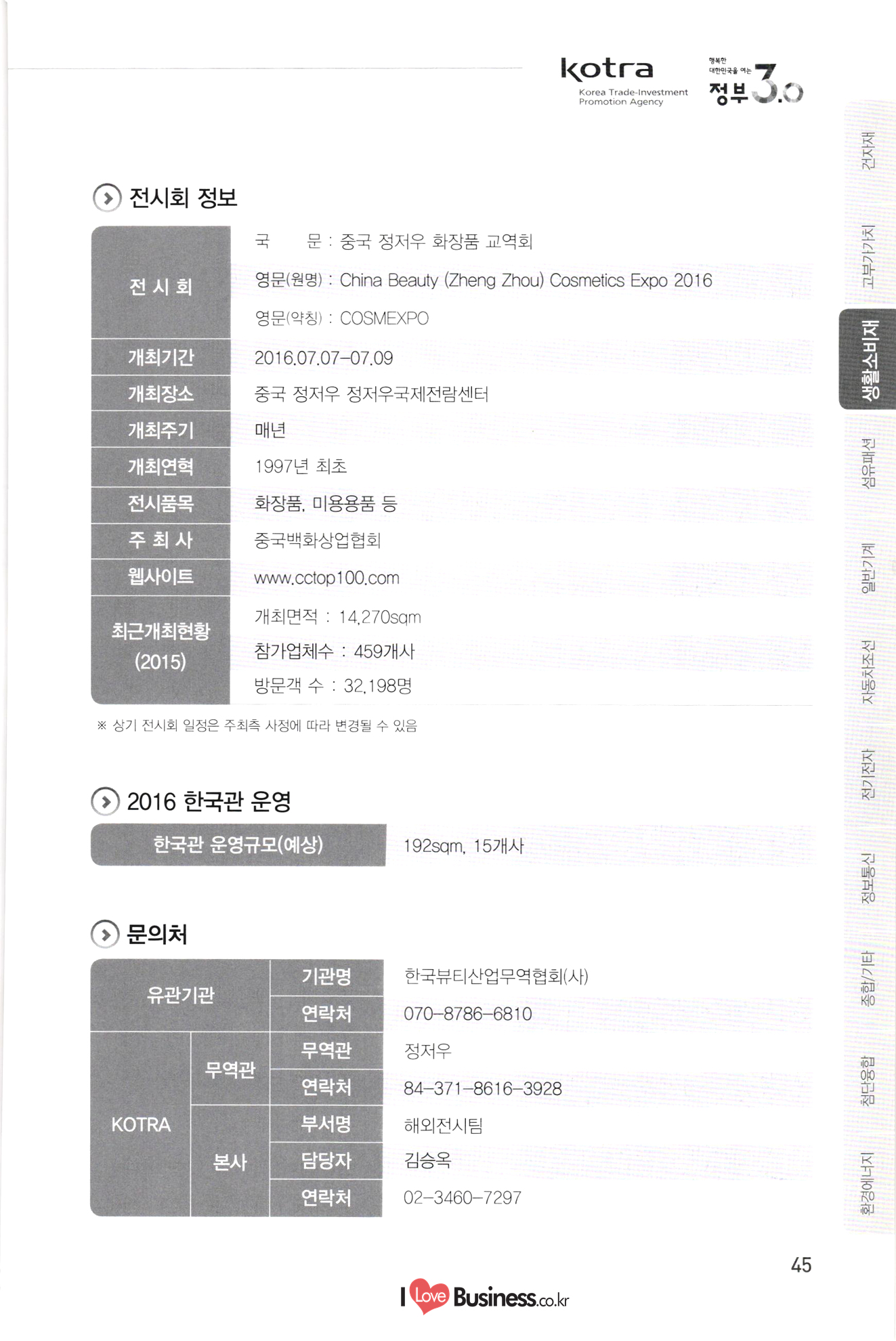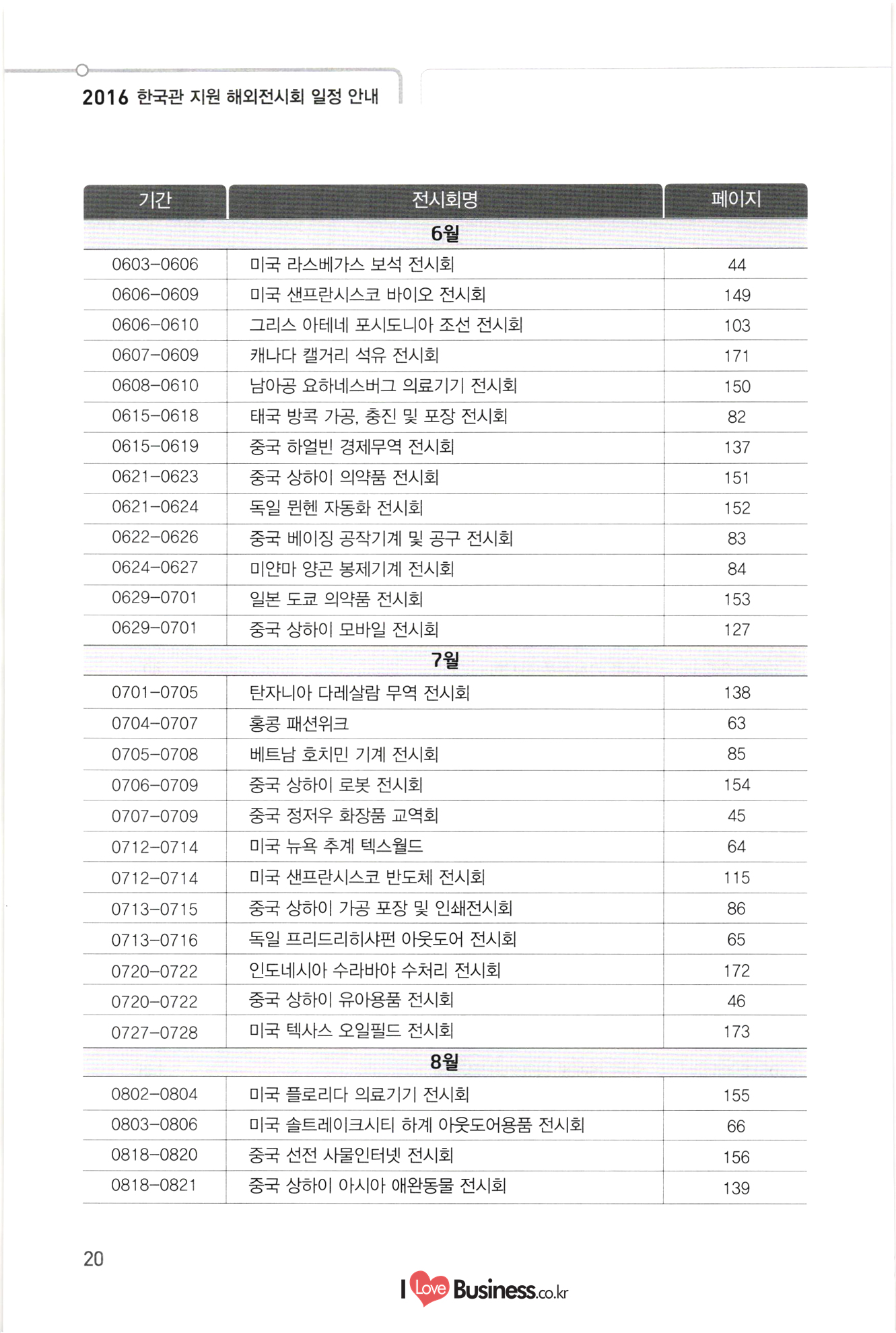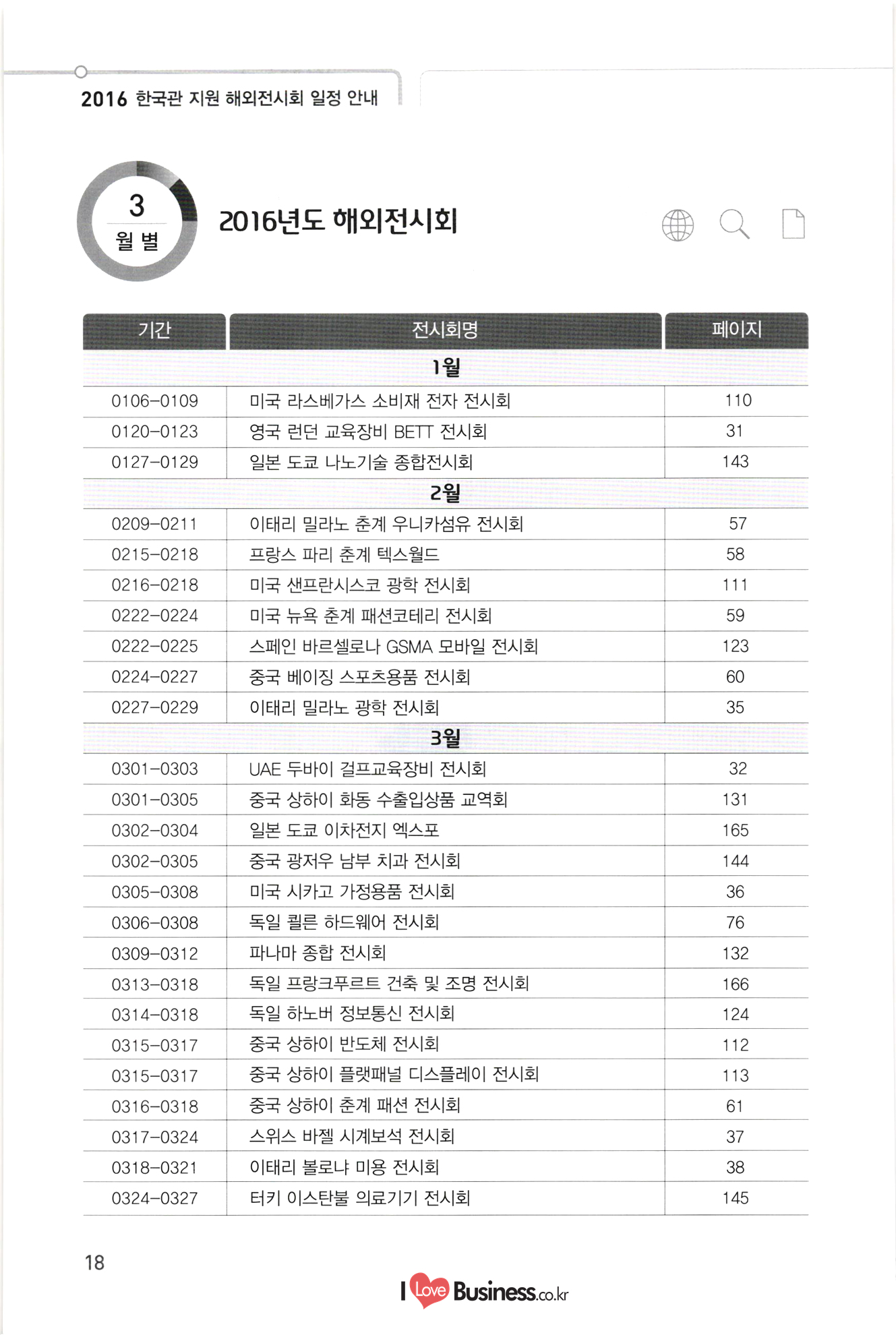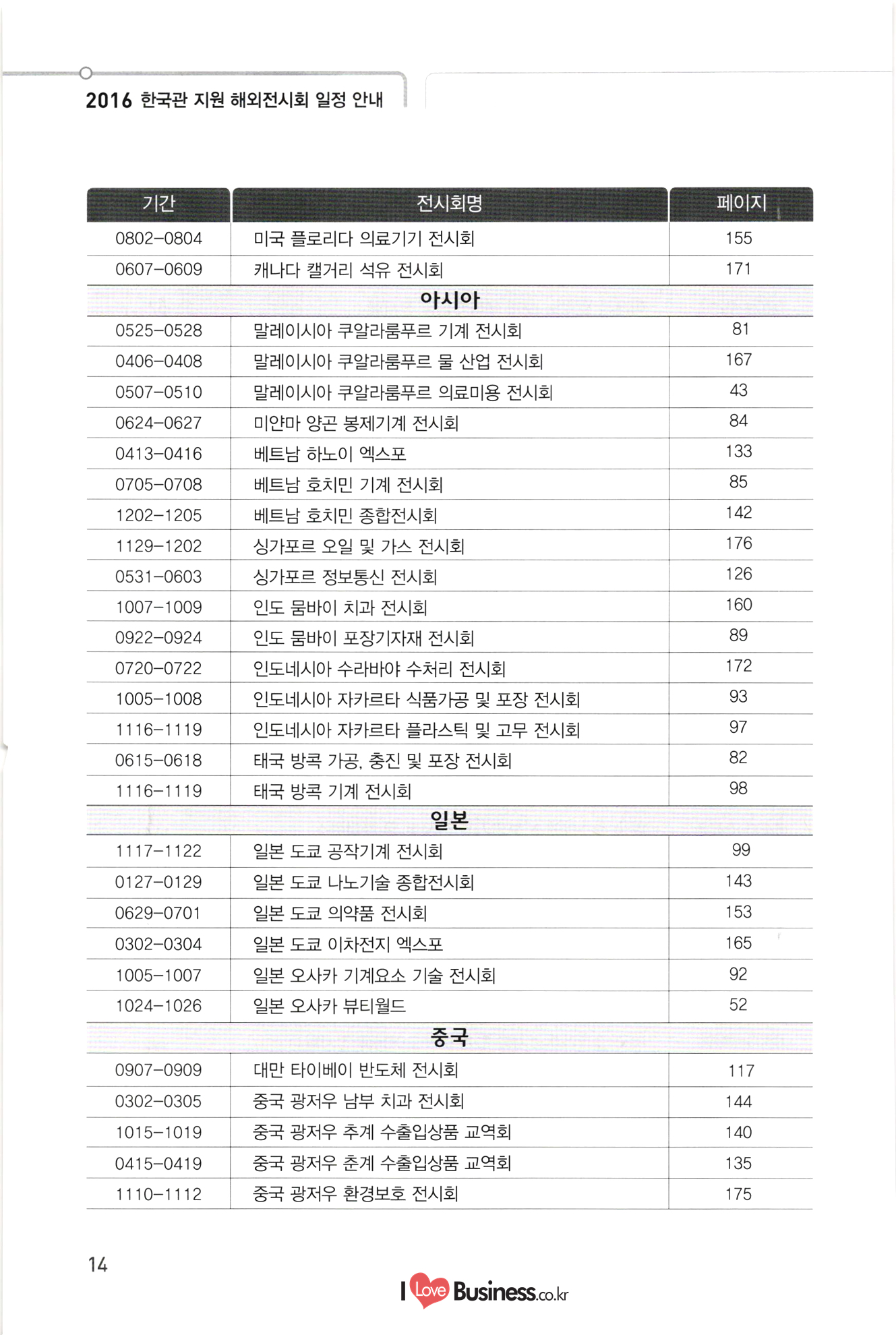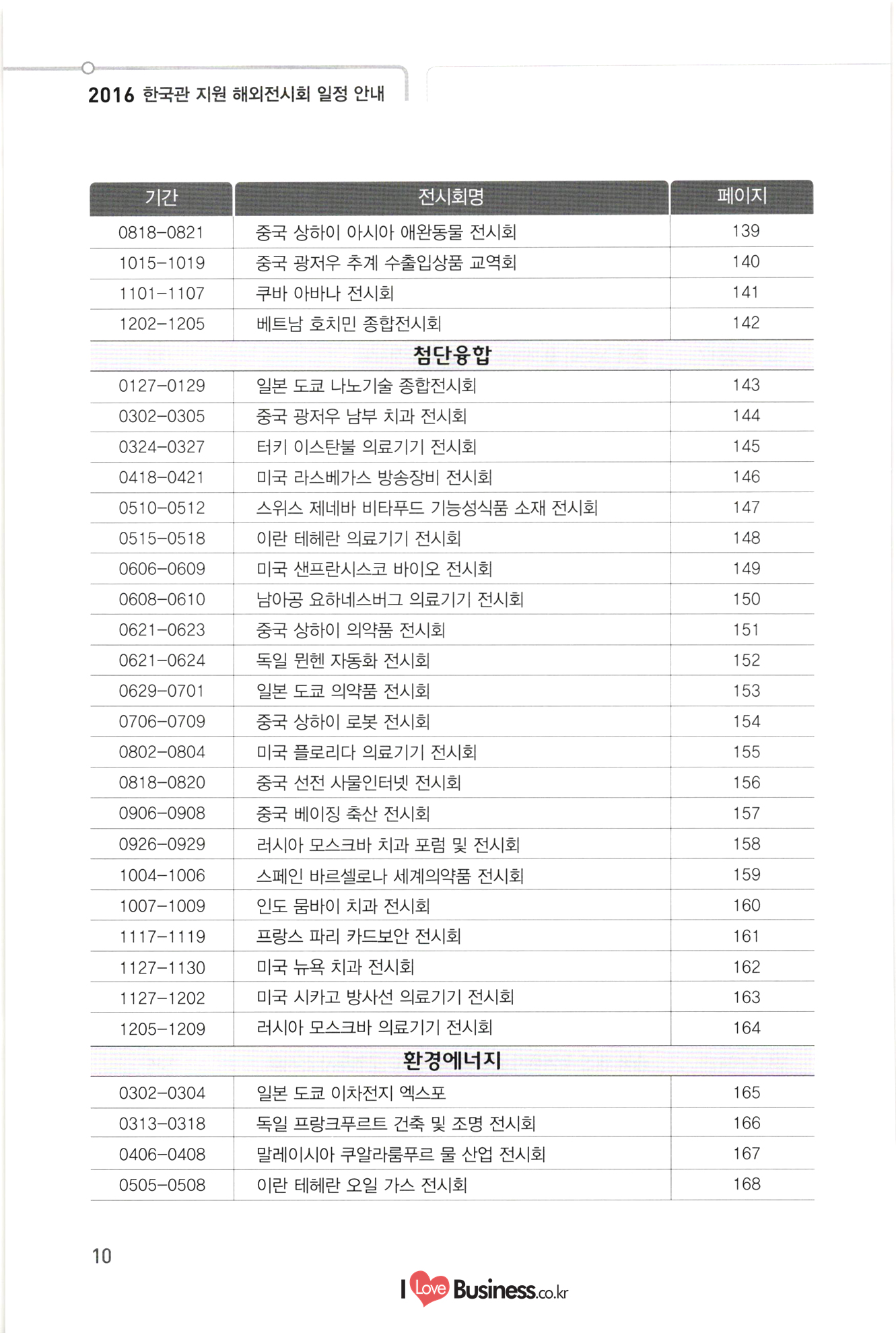 2016 한국관 지원 해외전시회 일정 안내 기간 전시회명 페이지 139 140 141 142 143 144 145 146 147 148 149 150 151 152 0818-0821 중국 상하이 아시아 애완동물 전시회 1015-1019 중국 광저우 추계 수출입상품 교역회 1101-1107 쿠바 아바나 전시회 1202-1205 1 | 베트남 호치민 종합전시회 첨단융합 0127-0129 일본 도쿄 나노기술 종합전시회 0302-0305 중국 광저우 남부 치과 전시회 0324-0327 터키 이스탄불 의료기기 전시회 0418-0421 미국 라스베가스 방송장비 전시회 10510-0512 | 스위스 제네바 비타푸드 기능성식품 소재 전시회 0515-0518 1 이란 테헤란 의료기기 전시회 0606-0609 미국 샌프란시스코 바이오 전시회 0608-0610 남아공 요하네스버그 의료기기 전시회 0621-0623 중국 상하이 의약품 전시회 0621-0624 독일 뮌헨 자동화 전시회 0629-0701 일본 도쿄 의약품 전시회 0706-0709 중국 상하이 로봇 전시회 10802-0804 미국 플로리다 의료기기 전시회 0818-0820 중국 선전 사물인터넷 전시회 0906-0908 중국 베이징 축산 전시회 10926-0929 러시아 모스크바 치과 포럼 및 전시회 1004-1006 스페인 바르셀로나 세계의약품 전시회 1007-1009 인도 뭄바이 치과 전시회 1117-1119 1 프랑스 파리 카드보안 전시회 1127-1130 | 미국 뉴욕 치과 전시회 1127-1202 미국 시카고 방사선 의료기기 전시회 1205-1209 러시아 모스크바 의료기기 전시회 환경에너지 0302-0304 | 일본 도쿄 이차전지 엑스포 0313-0318 독일 프랑크푸르트 건축 및 조명 전시회 0406-0408 말레이시아 쿠알라룸푸르 물 산업 전시회 0505-0508 | 이란 테헤란 오일 가스 전시회 153 154 155 156 157 158 159 160 161 162 163 164 A 지 165 166 167 168