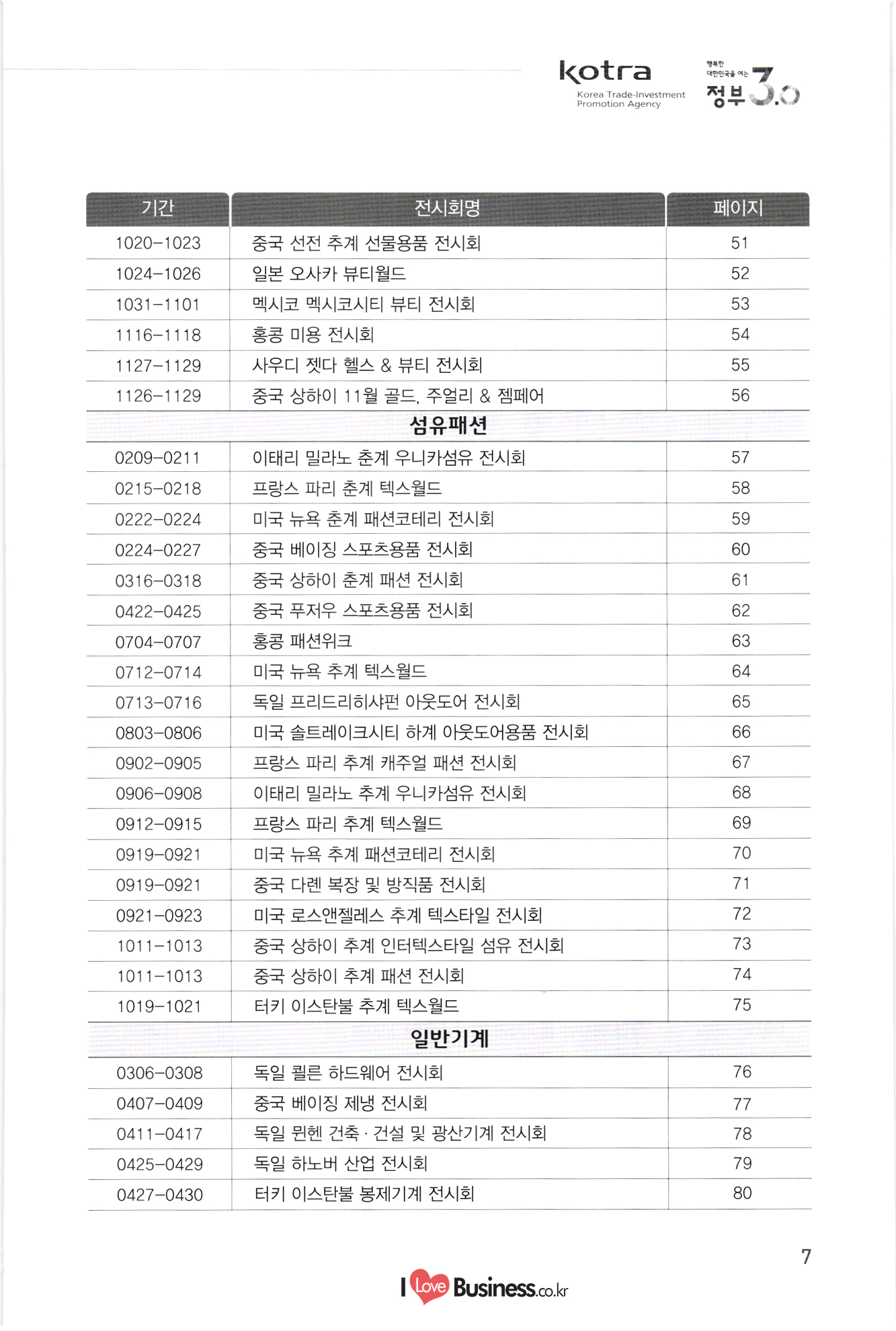 kotra 행복한 대한민국을 여는 Korea Trade-Investment Promotion Agency - 기간 : 페이지 51 52 1020-1023 1024-1026 1031-1101 1116-1118 53 54 1127-1129 55 | 1126-1129 56 57. 58 60 3. 전시회명 중국 선전 추계 선물용품 전시회 일본 오사카 뷰티월드 멕시코 멕시코시티 뷰티 전시회 홍콩 미용 전시회 사우디 젯다 헬스 & 뷰티 전시회 중국 상하이 11월 골드, 주얼리 & 젬페어 섬유패션 | 이태리 밀라노 춘계 우니카섬유 전시회 프랑스 파리 춘계 텍스월드 미국 뉴욕 춘계 패션코테리 전시회 중국 베이징 스포츠용품 전시회 중국 상하이 춘계 패션 전시회 중국 푸저우 스포츠용품 전시회 홍콩 패션위크 미국 뉴욕 추계 텍스월드 독일 프리드리히샤펀 아웃도어 전시회 미국 솔트레이크시티 하계 아웃도어용품 전시회 프랑스 파리 추계 캐주얼 패션 전시회 이태리 밀라노 추계 우니카섬유 전시회 프랑스 파리 추계 텍스월드 미국 뉴욕 추계 패션코테리 전시회 중국 다롄 복장 및 방직품 전시회 미국 로스앤젤레스 추계 텍스타일 전시회 중국 상하이 추계 인터텍스타일 섬유 전시회 중국 상하이 추계 패션 전시회 터키 이스탄불 추계 텍스월드 일반기계 독일 쾰른 하드웨어 전시회 중국 베이징 제냉 전시회 독일 뮌헨 건축 · 건설 및 광산기계 전시회 독일 하노버 산업 전시회 | 터키 이스탄불 봉제기계 전시회 0209-02111 0215-0218 0222-0224 0224-0227 0316-0318 0422-0425 0704-0707 0712-0714 0713-0716 0803-0806 0902-0905 0906-0908 0912-0915 0919-0921 0919-0921 0921-0923 1011-1013 1011-1013 1019-1021 65 66 69, 170. 71 72 73. 74 75 76 77. 0306-0308 0407-0409 0411-0417 0425-0429 0427-0430 78 79. 80