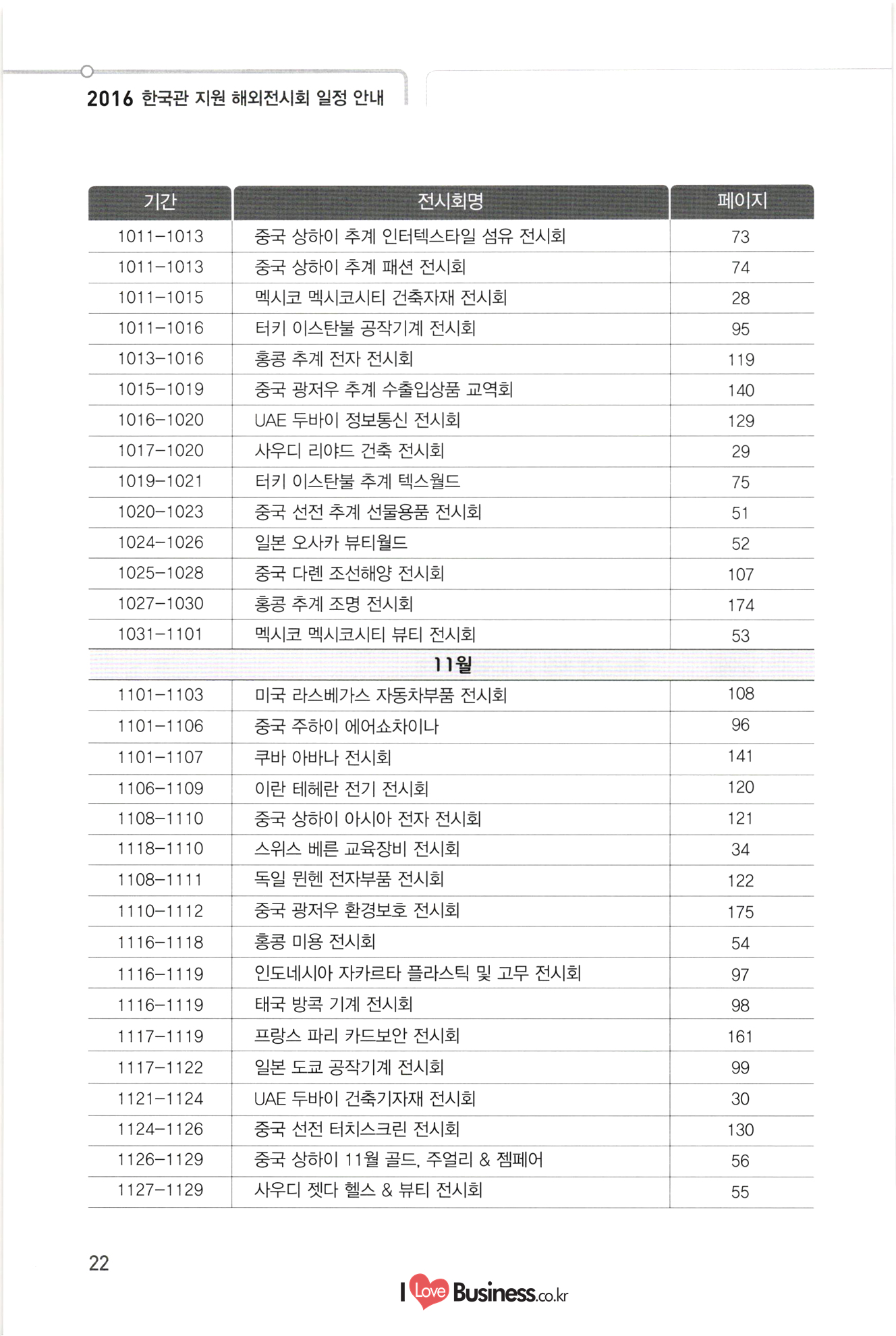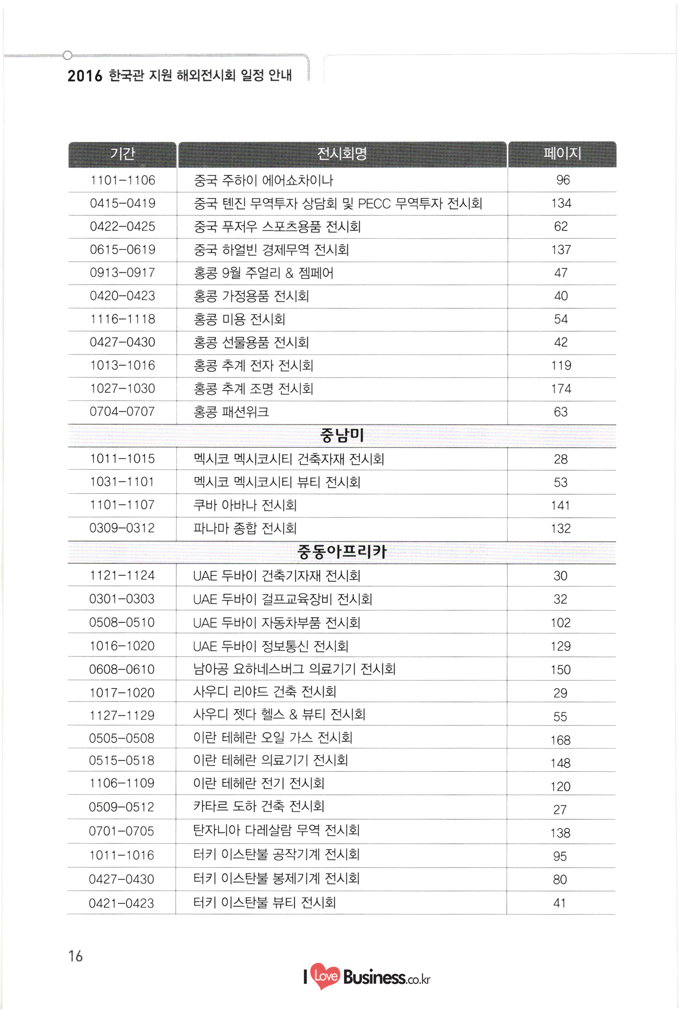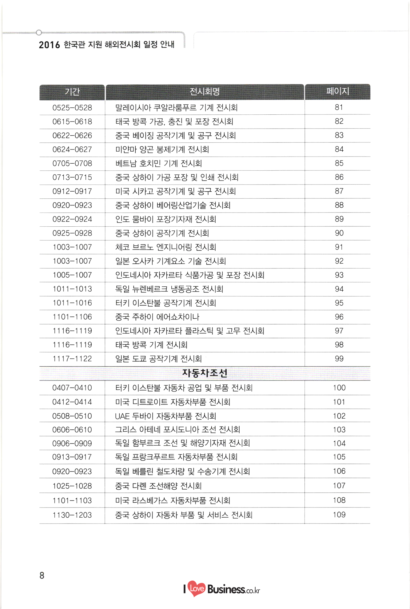 2016 한국관 지원 해외전시회 일정 안내 기간 전시회명 페이지 81 82 83 84 85 89. 93 94 0525-0528 말레이시아 쿠알라룸푸르 기계 전시회 0615-0618 태국 방콕 가공, 충진 및 포장 전시회 0622-0626 중국 베이징 공작기계 및 공구 전시회 | 0624-0627 미얀마 양곤 봉제기계 전시회 0705-0708 베트남 호치민 기계 전시회 10713-0715 중국 상하이 가공 포장 및 인쇄 전시회 10912-0917 | 미국 시카고 공작기계 및 공구 전시회 0920-0923 중국 상하이 베어링산업기술 전시회 0922-0924 인도 뭄바이 포장기자재 전시회 0925-0928 중국 상하이 공작기계 전시회 1003-1007 체코 브르노 엔지니어링 전시회 1003-1007 일본 오사카 기계요소 기술 전시회 1005-1007 인도네시아 자카르타 식품가공 및 포장 전시회 1011-1013 독일 뉴렌베르크 냉동공조 전시회 1011-1016 터키 이스탄불 공작기계 전시회 1101-1106 중국 주하이 에어쇼차이나 1116-1119 인도네시아 자카르타 플라스틱 및 고무 전시회 1116-1119 태국 방콕 기계 전시회 1117-1122 일본 도쿄 공작기계 전시회 자동차조선 10407-0410 | | 터키 이스탄불 자동차 공업 및 부품 전시회 10412-0414 1 미국 디트로이트 자동차부품 전시회 0508-0510 UAE 두바이 자동차부품 전시회회 0606-0610 그리스 아테네 포시도니아 조선 전시회 0906-0909 독일 함부르크 조선 및 해양기자재 전시회 0913-0917 독일 프랑크푸르트 자동차부품 전시회 0920-0923 독일 베를린 철도차량 및 수송기계 전시회 1025-1028 중국 다롄 조선해양 전시회 1101-1103 미국 라스베가스 자동차부품 전시회 1130-1203 중국 상하이 자동차 부품 및 서비스 전시회 96 197 98 100 101 102 103 104 105 106 107 108 109