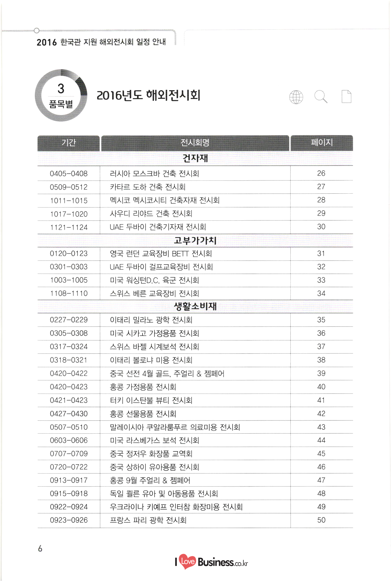2016 한국관 지원 해외전시회 일정 안내 3 | 2016년도 해외전시회 품목별 기간 0405-0408 0509-0512 1011-1015 1017-1020 1121-1124 0120-0123 0301-0303 1003-1005 1108-11101 0227-0229 | 0305-0308 0317-0324 0318-0321 0420-0422 0420-0423 0421-0423 전시회명 건자재 러시아 모스크바 건축 전시회 카타르 도하 건축 전시회 멕시코 멕시코시티 건축자재 전시회 사우디 리야드 건축 전시회 UAE 두바이 건축기자재 전시회 고부가가치 영국 런던 교육장비 BETT 전시회 UAE 두바이 걸프교육장비 전시회 미국 워싱턴D.C. 육군 전시회 스위스 베른 교육장비 전시회 생활소비재 이태리 밀라노 광학 전시회 미국 시카고 가정용품 전시회 | 스위스 바젤 시계보적 전시회 이태리 볼로냐 미용 전시회 중국 선전 4월 골드, 주얼리 & 젬페어 홍콩 가정용품 전시회 터키 이스탄불 뷰티 전시회 홍콩 선물용품 전시회 말레이시아 쿠알라룸푸르 의료미용 전시회 미국 라스베가스 보석 전시회 중국 정저우 화장품 교역회 중국 상하이 유아용품 전시회 홍콩 9월 주얼리 & 젬페어 독일 쾰른 유아 및 아동용품 전시회 우크라이나 키예프 인터참 화장미용 전시회 프랑스 파리 광학 전시회 0427-0430 0507-0510 0603-0606 | 0707-0709 0720-0722 | 0913-0917 1 0915-0918 0922-0924 0923-0926