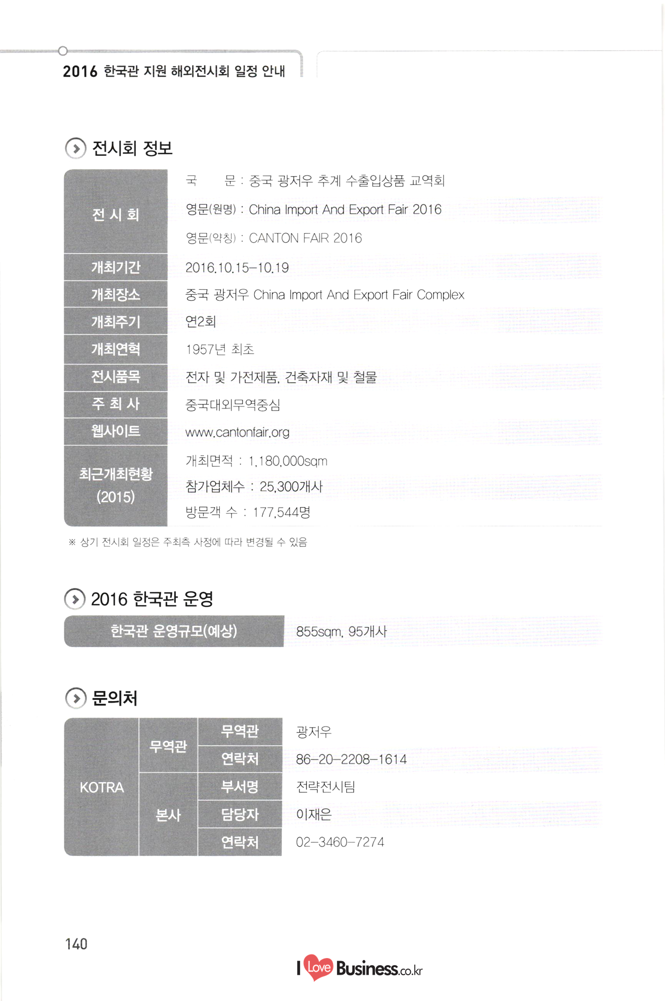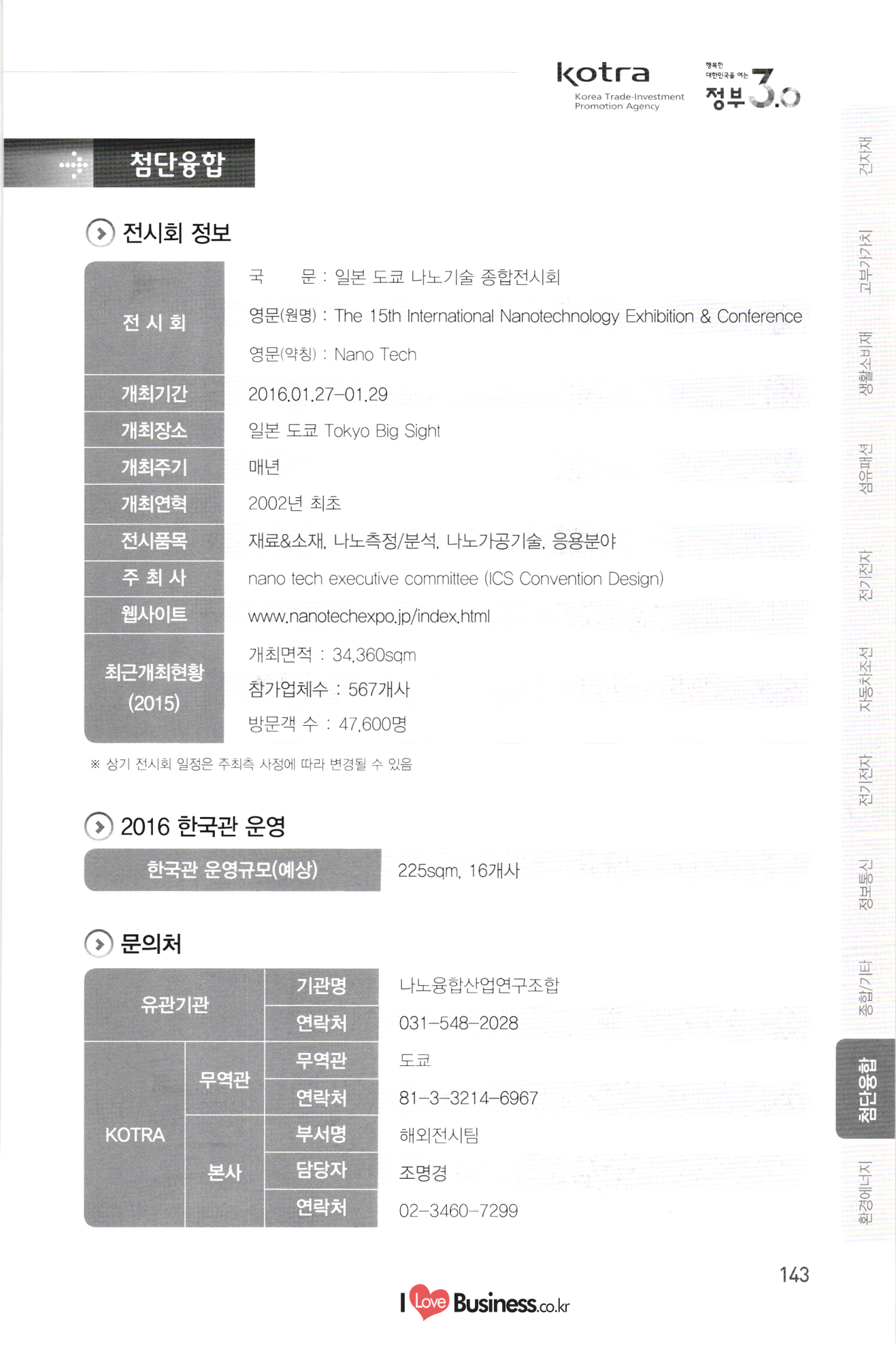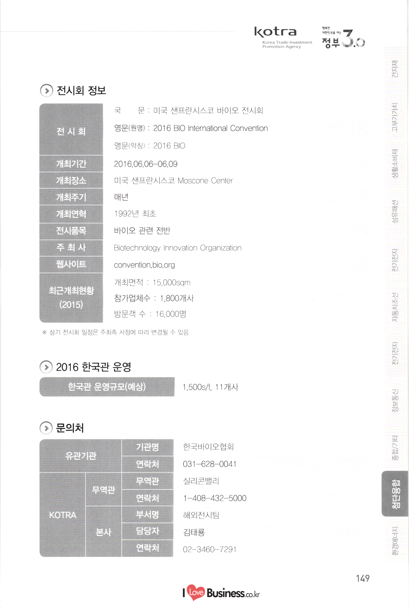 2016 한국관 지원 해외전시회 일정 안내 기간 전시회명 페이지 139 140 141 142 143 144 145 146 147 148 149 150 151 152 0818-0821 중국 상하이 아시아 애완동물 전시회 1015-1019 중국 광저우 추계 수출입상품 교역회 1101-1107 쿠바 아바나 전시회 1202-1205 1 | 베트남 호치민 종합전시회 첨단융합 0127-0129 일본 도쿄 나노기술 종합전시회 0302-0305 중국 광저우 남부 치과 전시회 0324-0327 터키 이스탄불 의료기기 전시회 0418-0421 미국 라스베가스 방송장비 전시회 10510-0512 | 스위스 제네바 비타푸드 기능성식품 소재 전시회 0515-0518 1 이란 테헤란 의료기기 전시회 0606-0609 미국 샌프란시스코 바이오 전시회 0608-0610 남아공 요하네스버그 의료기기 전시회 0621-0623 중국 상하이 의약품 전시회 0621-0624 독일 뮌헨 자동화 전시회 0629-0701 일본 도쿄 의약품 전시회 0706-0709 중국 상하이 로봇 전시회 10802-0804 미국 플로리다 의료기기 전시회 0818-0820 중국 선전 사물인터넷 전시회 0906-0908 중국 베이징 축산 전시회 10926-0929 러시아 모스크바 치과 포럼 및 전시회 1004-1006 스페인 바르셀로나 세계의약품 전시회 1007-1009 인도 뭄바이 치과 전시회 1117-1119 1 프랑스 파리 카드보안 전시회 1127-1130 | 미국 뉴욕 치과 전시회 1127-1202 미국 시카고 방사선 의료기기 전시회 1205-1209 러시아 모스크바 의료기기 전시회 환경에너지 0302-0304 | 일본 도쿄 이차전지 엑스포 0313-0318 독일 프랑크푸르트 건축 및 조명 전시회 0406-0408 말레이시아 쿠알라룸푸르 물 산업 전시회 0505-0508 | 이란 테헤란 오일 가스 전시회 153 154 155 156 157 158 159 160 161 162 163 164 A 지 165 166 167 168
